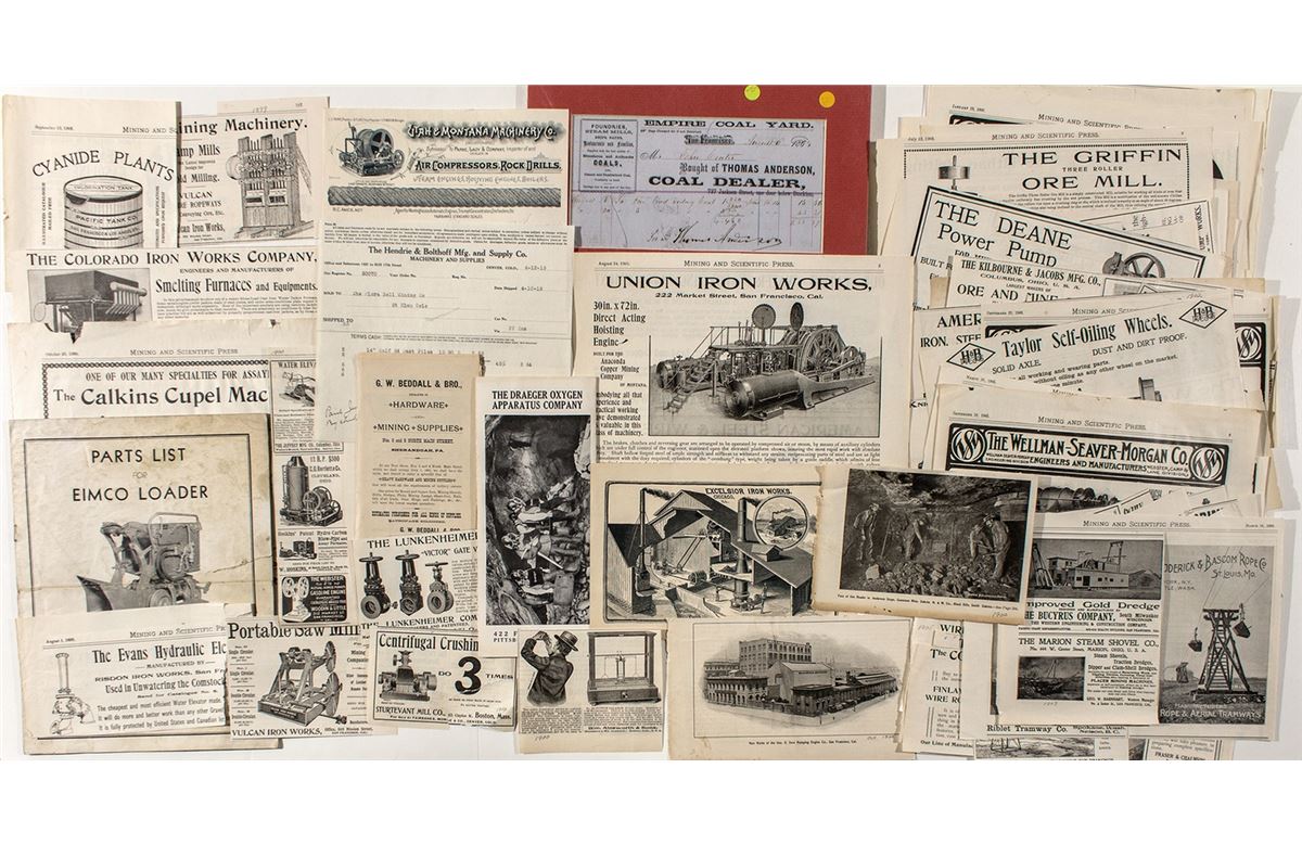 Over 200 (some duplicates) terrific (great illustrations and news photos) brochures, newspaper ads, letters, agreements, newspaper articles of mining machinery.
