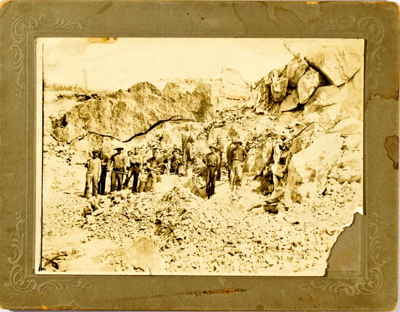 Cabinet card showing 11 miners in the foreground and a mine and rock formation immediately behind them. Measures 7" x 5" on light green matte with ornate border work at corners, measures 8" x 6 1/2". Contrast is medium with some fading noted. Focus is good. There are several spots on the image and matte and the right lower corner has been removed. No photographer, date, or location evident. These hard rock miners appear to be taking a break for the photograph, as several still have tools in their hands, including two that are holding a drill.