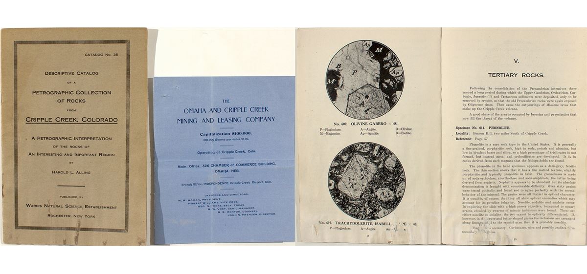 1) Prospectus for the Omaha and Cripple Creek Mining and Leasing Company. The company plans to "go right into the heart of this Gold Belt [in Cripple Creek], among the richest mines, and by leasing ground, that it could not possibly afford to buy, it will possess all the advantages of the richest companies in the District (except ownership)."They have already leased ground on Bull Hill adjacent to the Delmonico Mine, A shaft has been sunk. c.1900. Four pages on blue cardstock. Folds and pinholes. 7" x 6" 2) Catalog No. 35. Descriptive Catalog of a Petrographic COllection of Rocks from Cripple Creek, Colorado. By Harold L. Alling. Published by Ward's Natural Science Establishment. Softcover. 24 pages with a few photographs. 1918. These specimens were collected on a trip by Professor P.G. Worcester of the University of Colorado in 1918. "We offer this catalog in the hope that it may be of practical aid to all who wish to study the rather remarkable series of rocks in this great gold camp." Writing on the inside and some stains. 9" x 6"