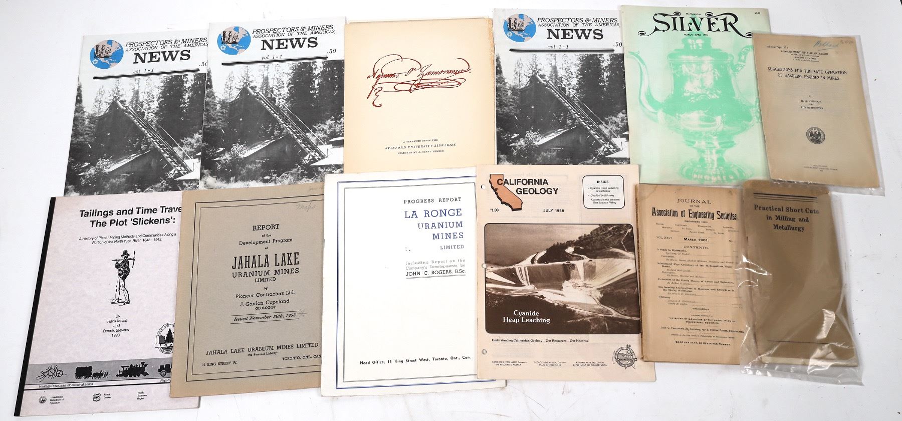 Group of publications and reports related to mining. Includes Journal of the Association of Engineering Societies, Practical Short Cuts in Milling and Metallurgy, Suggestions of the Safe Operation of Gasoline Engines in Mines, Prospectors & Miners Association of the Americas News (3 copies), the Magazine Silver, California Geology, Uranium mines reports, etc. Early to late 20th century. Good condition.