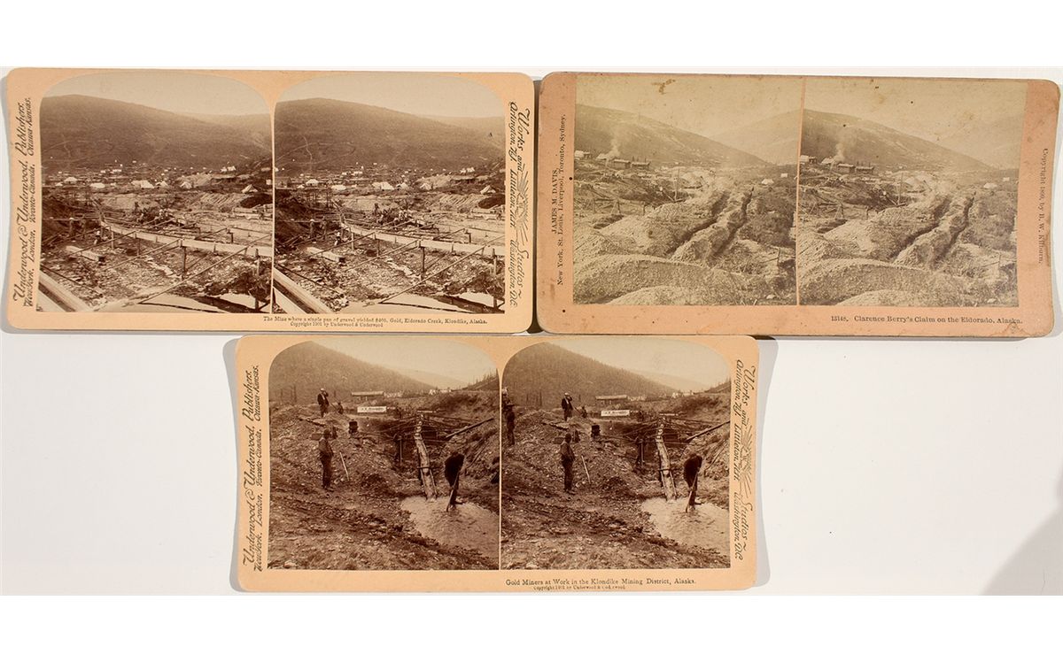 Three great views from the El Dorado Creek and Klondike Districts of Alaska. 2 of the stereoviews were photographed and published by Works and Sun Sculpture Studios and Underwood & Underwood Publishers. Both have medium contrast and the focus is sharp. The other was photographed and published by B.W. Kilburn of New Hampshire. The stereoview measure3” x3.05” and 7” x 3.80” on the matte. It has low to medium contrast and the focus is sharp. There is also some surface wear. Bud Bassett Collection - HKA#65459