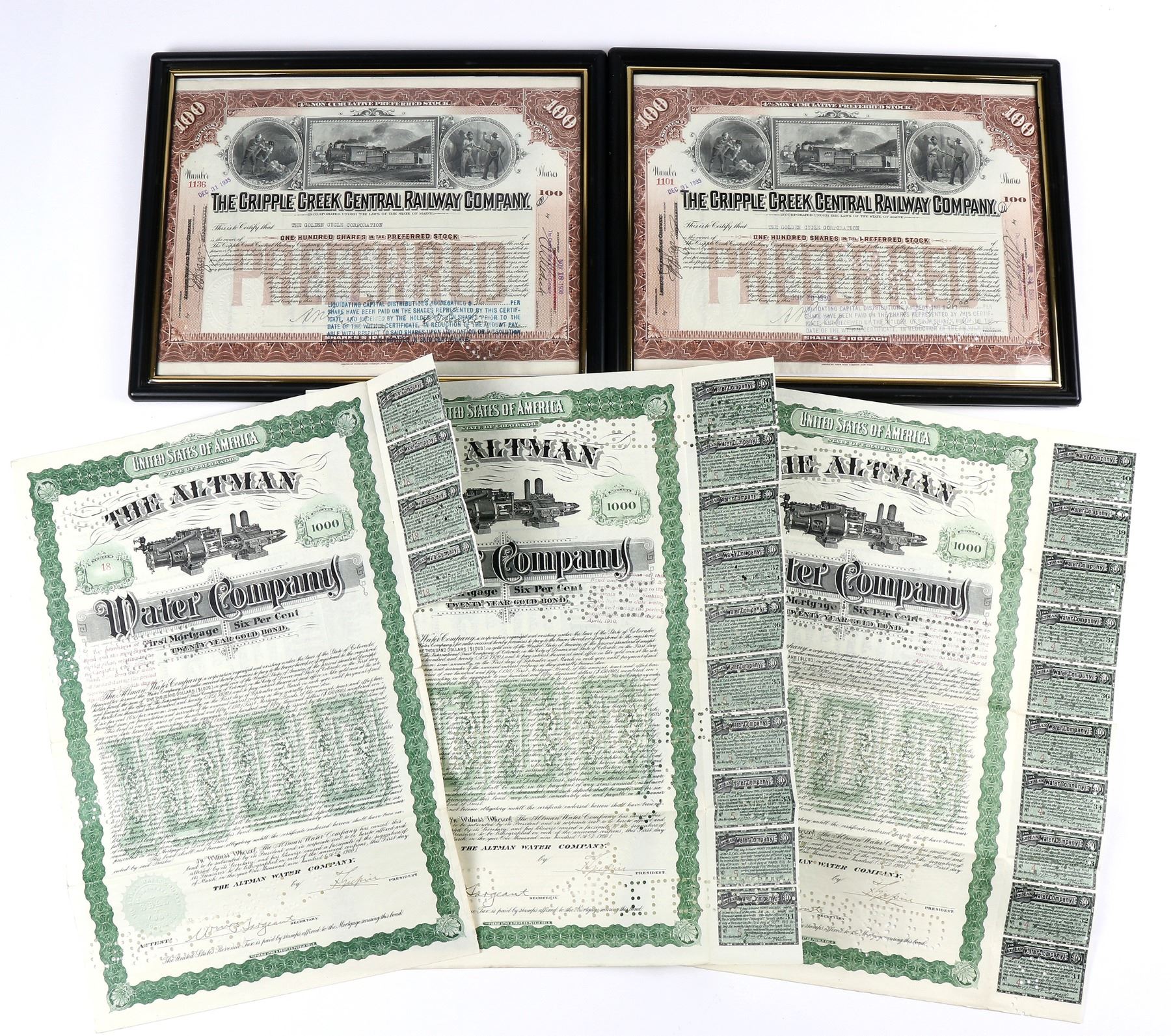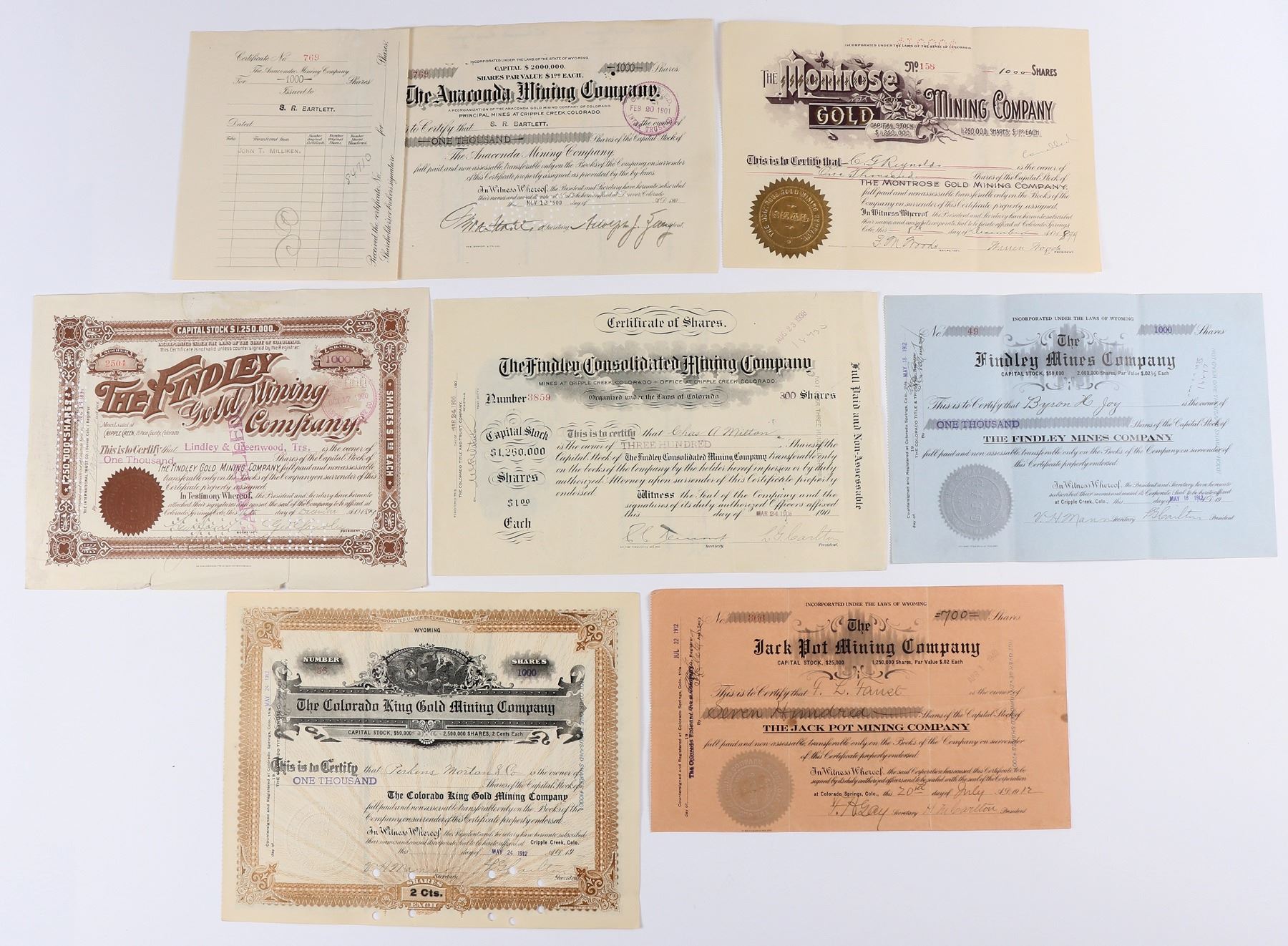 7 Colorado mining stocks with notable autographs. H M Carlton-"H M Carlton-father of "Albert E. Carlton or Bert Carlton (20 February 1866 ñ 1931) was an investor in Colorado banks, mines and railroads. Based upon the success of his mines in Cripple Creek, he was known as "King of Cripple Creek" from wikipedia, Geo. E Findley-some condition issues, Warren Woods-likely related to Adolph Zang, brewer, Adolph Zang-brewer. 3x L G Carlton-mine director.