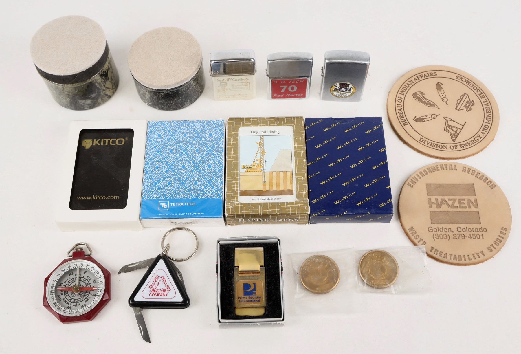 Mining Tradeshow Collectibles about 20 items from Shaddrick Collection, includes 3 advertising cigarette lighters, compass, 4 decks of cards and other goodies.