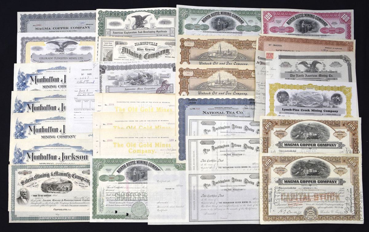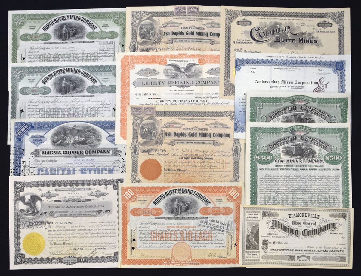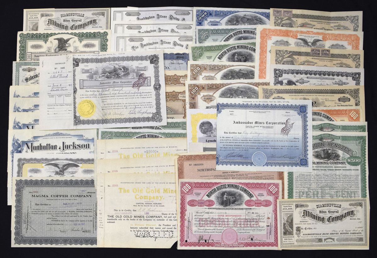 Various States...., ca. 1880s-1950s. Lot of 35+ Issued, Unissued, Cancelled, and Remainder Stocks and Bonds highlighting a variety of U.S. mining and mineral-related companies, Includes: North Carolina, 1894, $500, Langdon-Henszey Coal Mining Co., (2), I/U with coupons; Diamondville Blue Gravel Mining Co., North Butte Mining Co., Magma Copper Co., Ambassador Mines Corp., The Old Gold Mines Co., Manhattan Jackson Mining Co., Lynch-Pine Creek Mining Co., Liberty Refining Co., Ash Rapids Gold Mining Co., Michigan-Jefferson Corp., Copper Butte Mines, and others. Denominations vary from shares of capital stock to bonds in $500 denominations, with a range of colors including green, brown, blue, red, and orange. Many pieces feature detailed mining-themed vignettes, some with ornate company logos and period typography. Condition ranges from Fine to Very Fine overall. (35+). Sold "AS IS" no returns accepted.