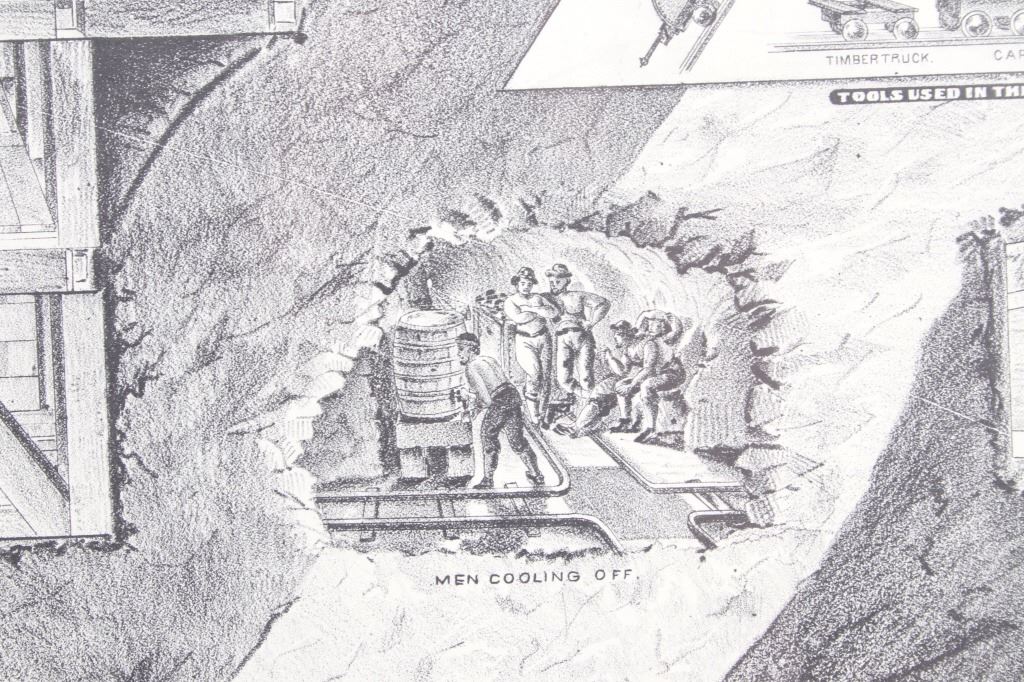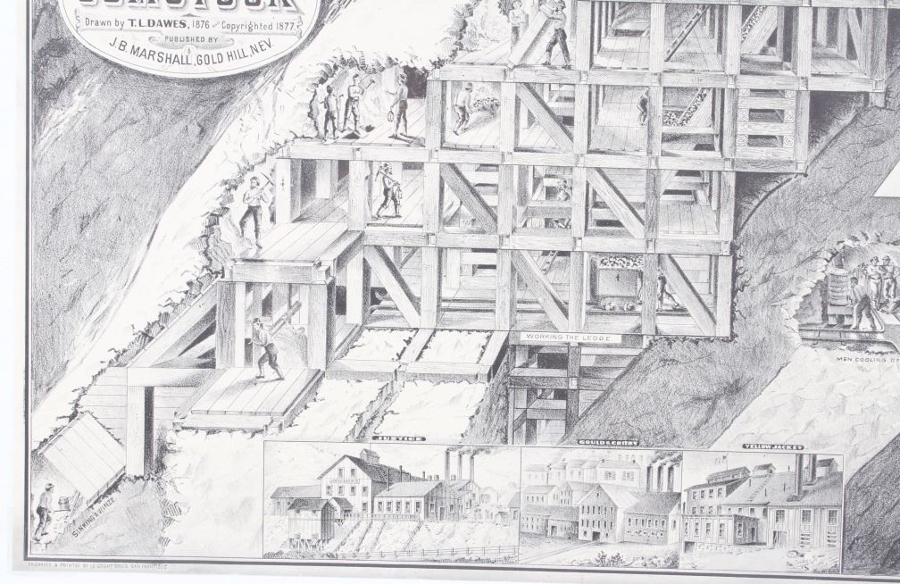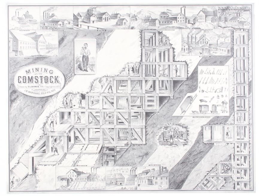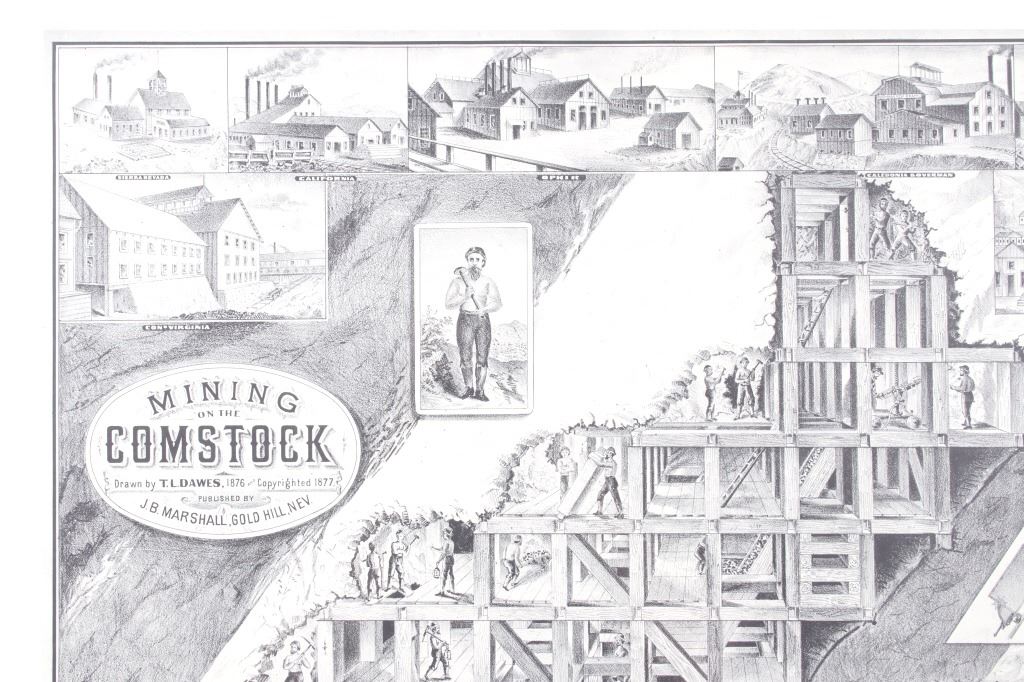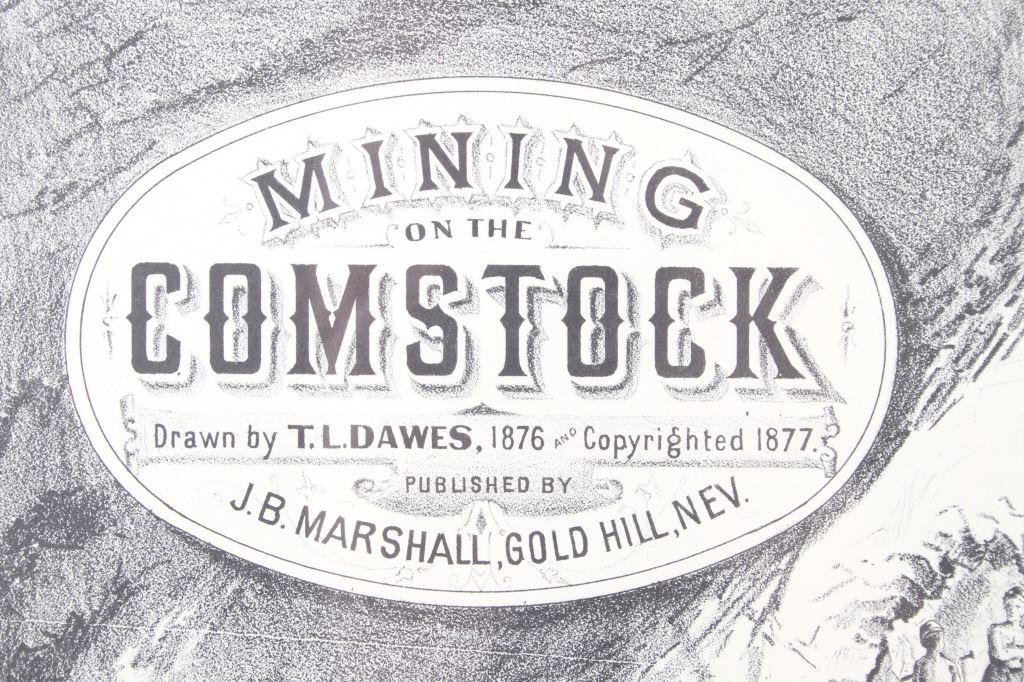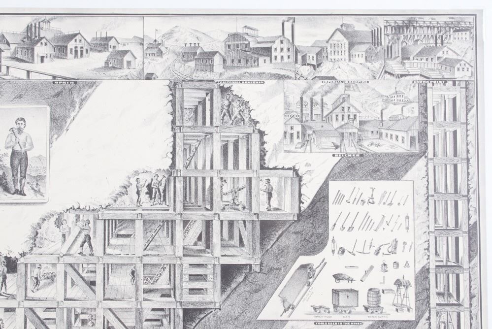 Featured in this lot is this is this engraving called "Mines of the Comstock by T.L. Dawes. Originally created in 1876 and was copyrighted in 1877. This engraving shows a interior of a mine with various building locations of Comstock mine operations including: Sierra Nevada, California, Ophir, Calidonia & Overman, Imperial & Empire, Crown Point, Con. Virginia, Belcher, Justice, Gould & Curry, and Yellow Jacket. It also shows frequently used tools in the mines. The label reads as follows: Mining on the Comstock - Drawn by T.L. Dawes, 1876 and copyrighted 1877 published by J.B. Mashall, Gold Hill, Nev. Down at the bottom reads: Engraved & Printed by Le Count Bros San Francisco. The condition of this engraving is good with no obvious signs of damage and in good overall well preserved condition. The measurements of this engraving are 21 3/8" x 28".