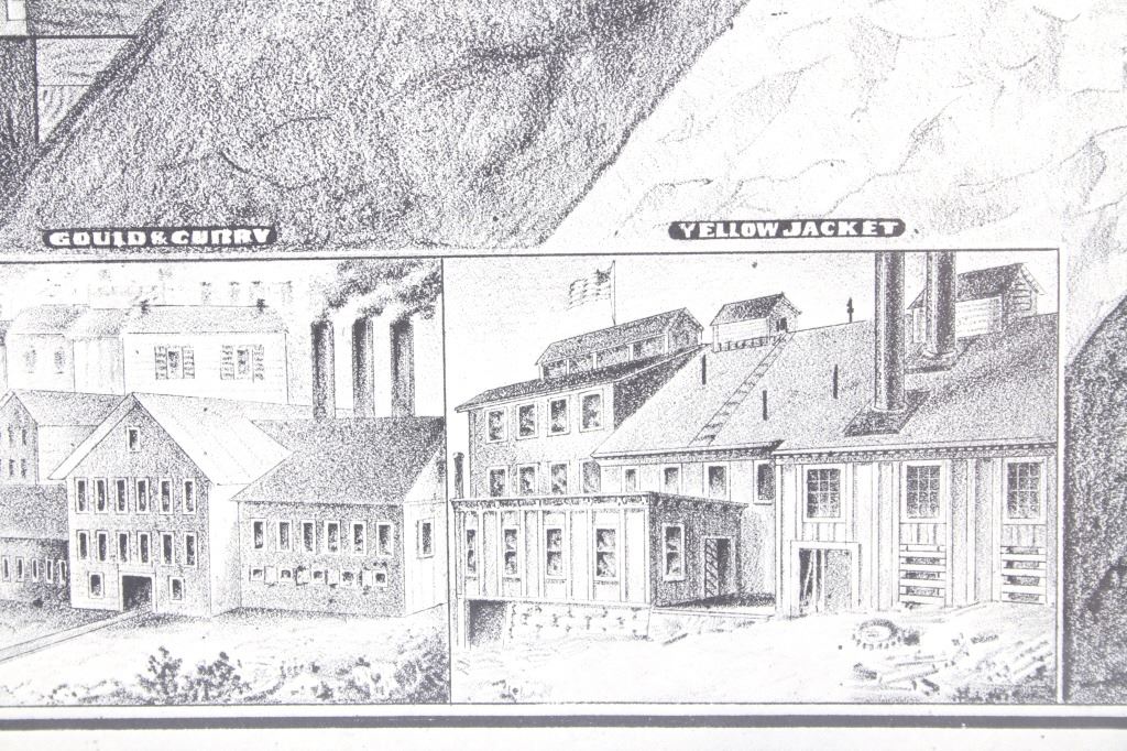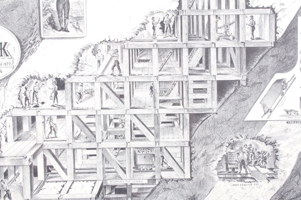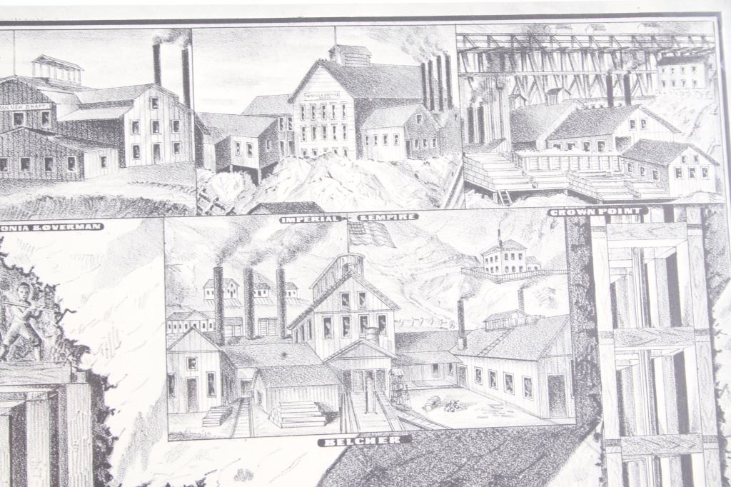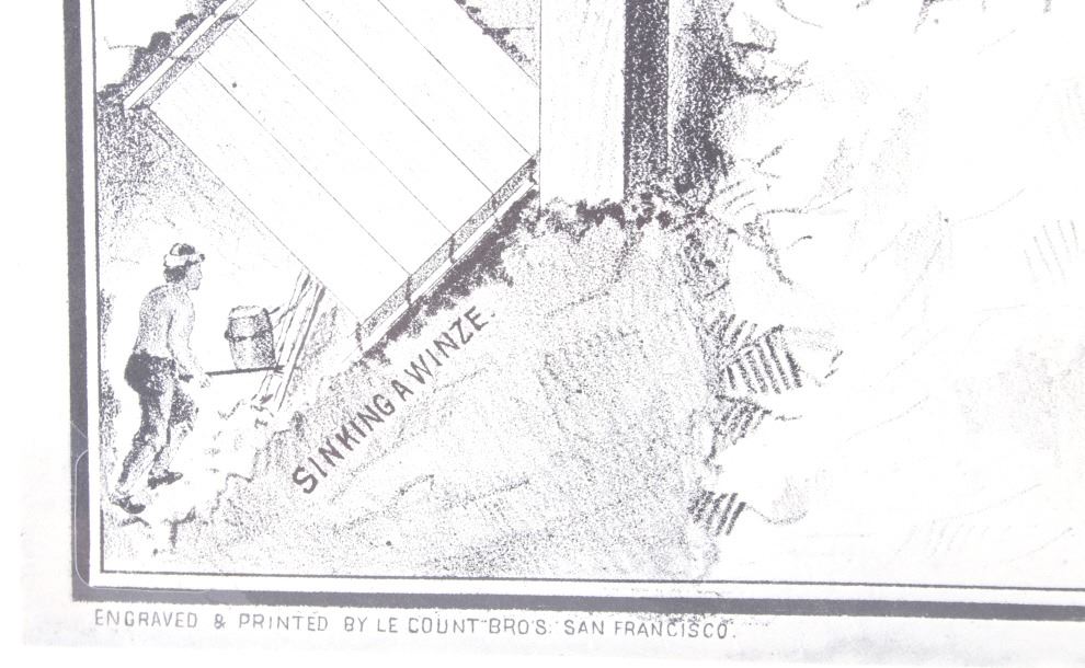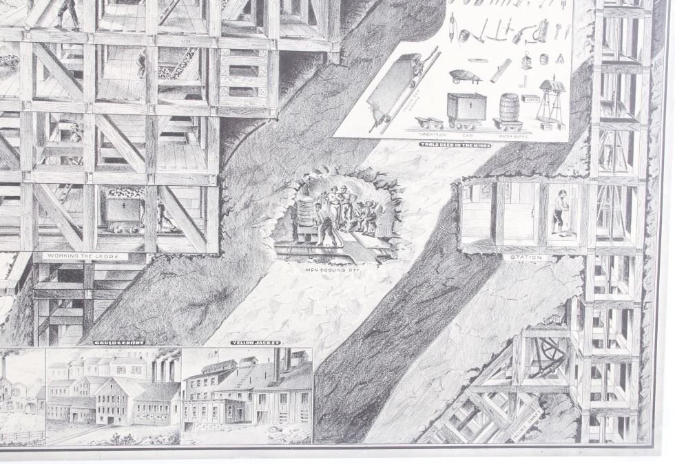 Featured in this lot is this is this engraving called "Mines of the Comstock by T.L. Dawes. Originally created in 1876 and was copyrighted in 1877. This engraving shows a interior of a mine with various building locations of Comstock mine operations including: Sierra Nevada, California, Ophir, Calidonia & Overman, Imperial & Empire, Crown Point, Con. Virginia, Belcher, Justice, Gould & Curry, and Yellow Jacket. It also shows frequently used tools in the mines. The label reads as follows: Mining on the Comstock - Drawn by T.L. Dawes, 1876 and copyrighted 1877 published by J.B. Mashall, Gold Hill, Nev. Down at the bottom reads: Engraved & Printed by Le Count Bros San Francisco. The condition of this engraving is good with no obvious signs of damage and in good overall well preserved condition. The measurements of this engraving are 21 3/8" x 28".