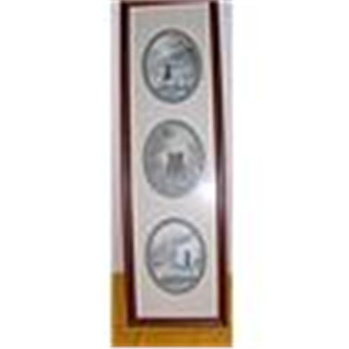 This is a delightful panel with three minature prints of Amish scenes done by a very talented Rebecca Bennet.They are all numbered and signed in pencil on the prints ...1)Girl with geese- 840/1000, 2)Black buggy- 10/1000, 3)Samuel- 497/1000. They are charming and very well matted and framed.