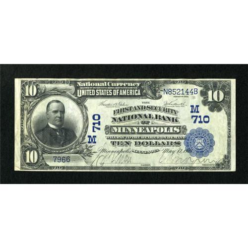 <B>Minneapolis, MN</B></I> - $10 1902 Date Back Fr. 623a <B>The First & Security NB</B></I> Ch. # (M)710<BR> This bright <B>Extremely Fine</B></I> $10 bears a very rare Treasury signature combination, the last used on Third Charter Date Backs. It was used here only due to a 1915 title change, which resulted in new plates being prepared utilizing the then-current Teehee-Burke signatures. <BR><BR><b>Shipping:</b> Coins & Currency (<a target="_blank" href="http://www.heritageauctions.com/common/shipping.php">view shipping information</a>)