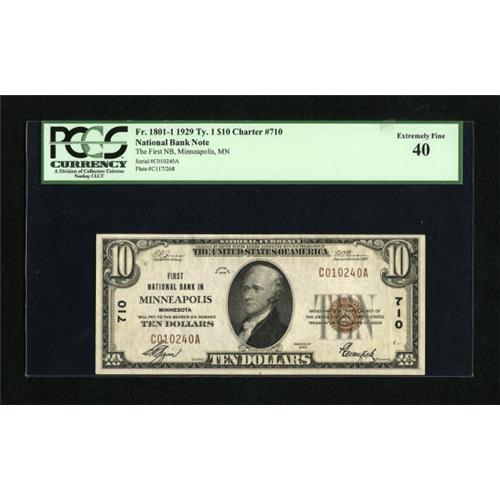 <B>Minneapolis, MN</B></I> - $10 1929 Ty. 1 <B>The First NB</B></I> Ch. # 710<BR> Inspection reveals light handling on this $10 with officers S.H. Bezoier and L.E. Wakefield. <B>PCGS Extremely Fine 40.</B></I><BR><BR><b>Shipping:</b> Coins & Currency (<a target="_blank" href="http://www.heritageauctions.com/common/shipping.php">view shipping information</a>)