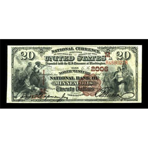 <B>Minneapolis, MN</B></I> - $20 1882 Brown Back Fr. 499 <B>The North Western NB</B></I> Ch. # (M)2006<BR> A perfectly margined $20 Brown Back with good color, bold signatures, and plenty of eye appeal. <B>Very Fine-Extremely Fine,</B></I> a perfect type note. <BR><BR><b>Shipping:</b> Coins & Currency (<a target="_blank" href="http://www.heritageauctions.com/common/shipping.php">view shipping information</a>)