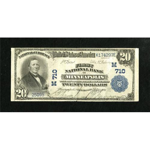 <B>Minneapolis, MN</B></I> - $20 1902 Plain Back Fr. 650 <B>The First NB</B></I> Ch. # (M)710<BR> A decent match to the $10 from this same bank. This piece features the scarce second title employed by the bank. <B>Very Good.</B></I><BR><BR><b>Shipping:</b> Coins & Currency (<a target="_blank" href="http://www.heritageauctions.com/common/shipping.php">view shipping information</a>)