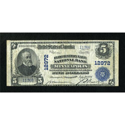<B>Minneapolis, MN</B></I> - $5 1902 Plain Back Fr. 609 <B>Bloomington-Lake NB</B></I> Ch. # 12972<BR> This late chartering bank issued only the $5 denomination and has just 15 large size notes in the census. Despite its circulation, this <B>Very Good-Fine</B></I> example is bright for its grade and retains bold printed signatures.<BR><BR><b>Shipping:</b> Coins & Currency (<a target="_blank" href="http://www.heritageauctions.com/common/shipping.php">view shipping information</a>)