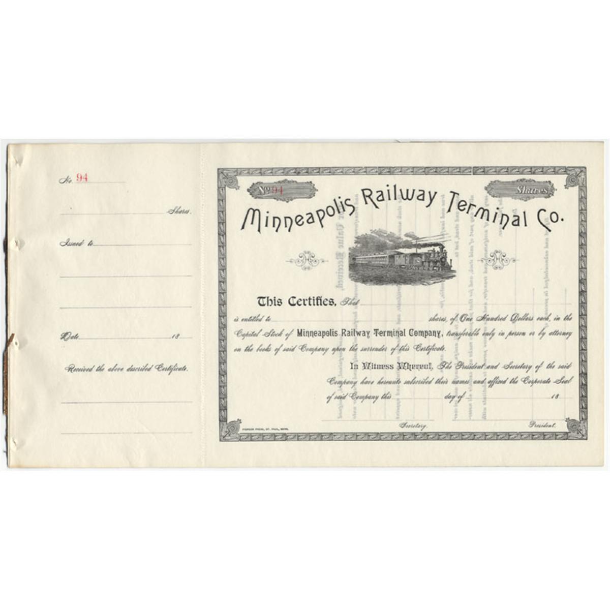 18--. Minnesota. Unissued stock certificate. Vignette of a steam locomotive at top center. Litho. Uncancelled and Excellent.