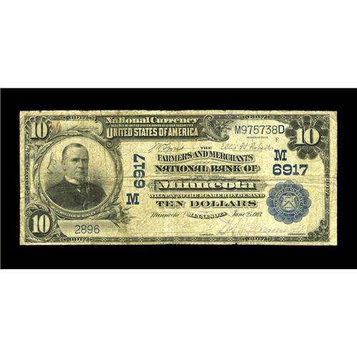 <B>Minneota, MN</B></I> - $10 1902 Plain Back Fr. 624 <B>The Farmers & Merchants NB</B></I> Ch. # (M) 6917<BR>Interesting font choice on the layout of this Lyon County institution. A red check and pencil writing on noted on the face, at left. <B>Very Good.</B></I>