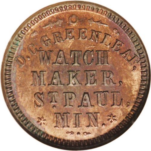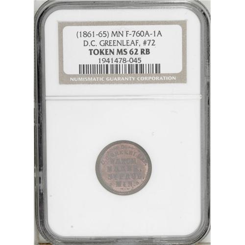 <B>(1861-65) D.C. Greenleaf/Watchmaker, Fuld-MN-760A-1a, R.8, St. Paul, MN, MS62 Red and Brown NGC.</B></I> This R.8 token is one of six known Civil War tokens from this scarce state. The number 72 is on the blank reverse. Quoting from the <I>U.S. Civil War Store Cards</B></I> catalog by George and Melvin Fuld, "No more than two of any number have been reported from 1 to 102 and most are known in single examples." In addition, all tokens from Minnesota are rare. The catalog estimate for this token is $700.<BR><I>From The Troy Wiseman Collection.</B></I>