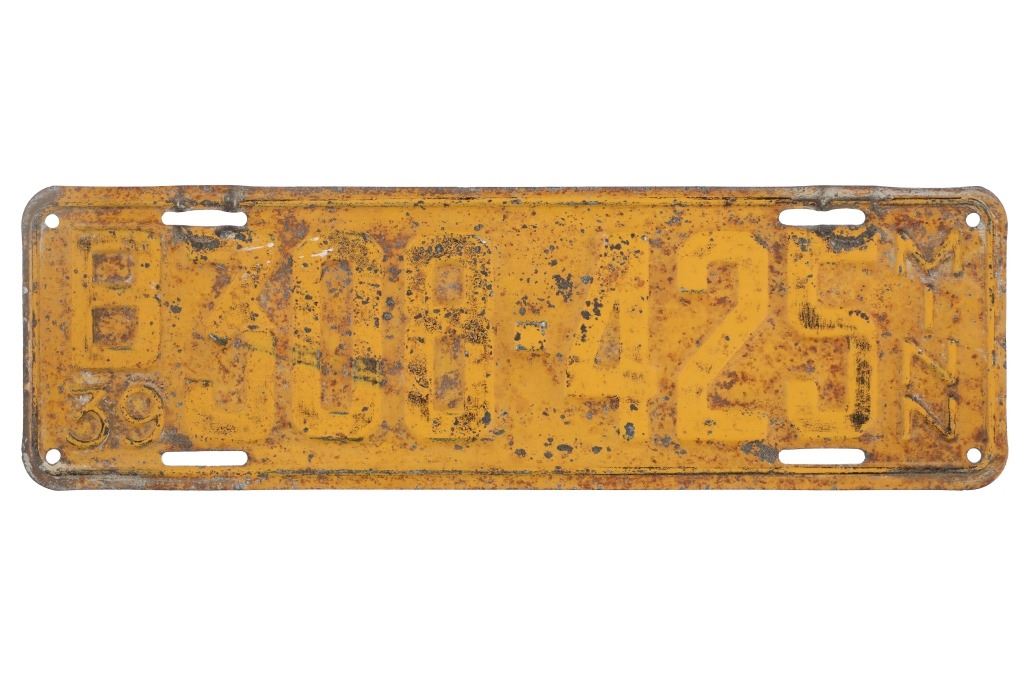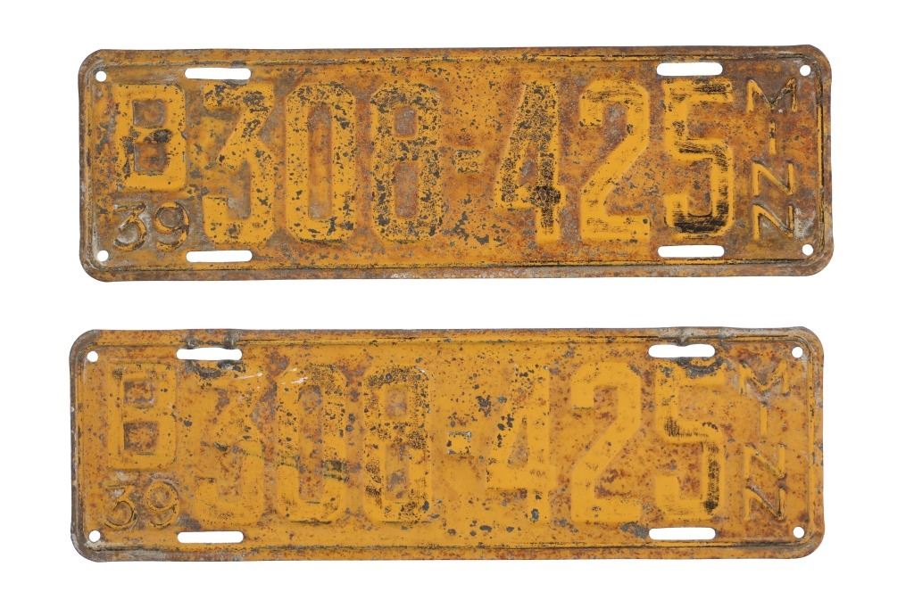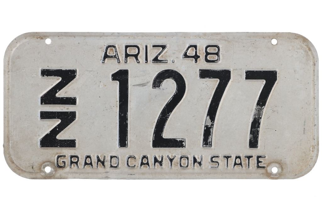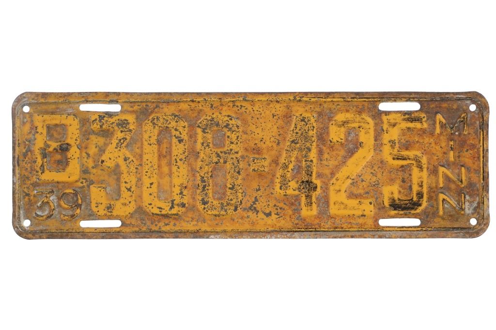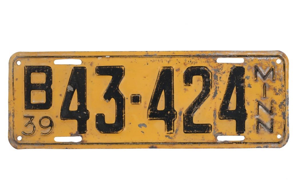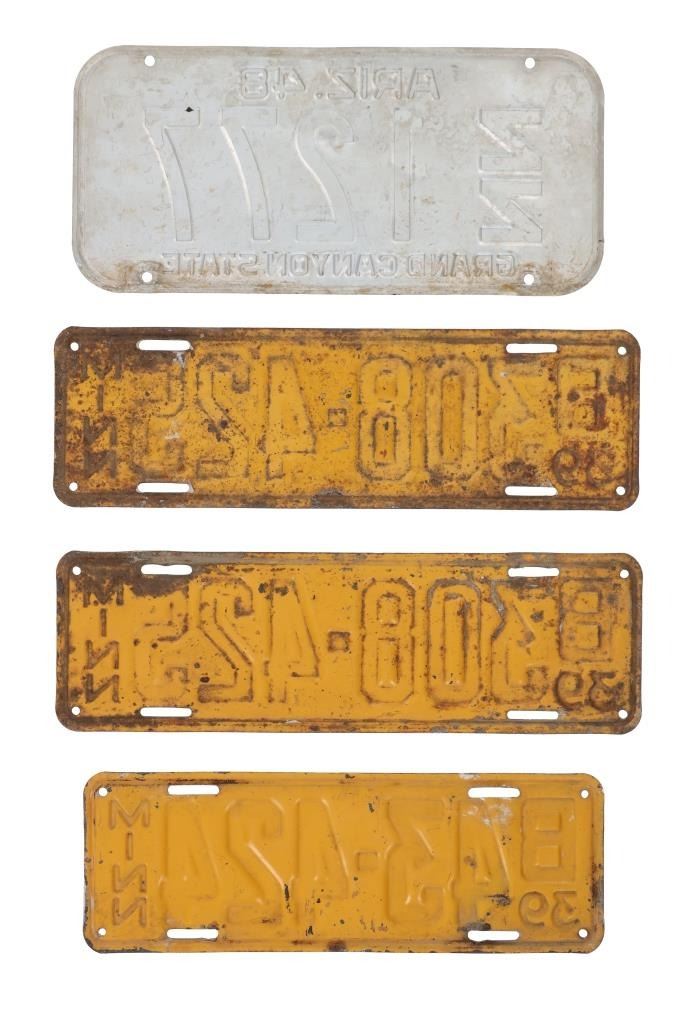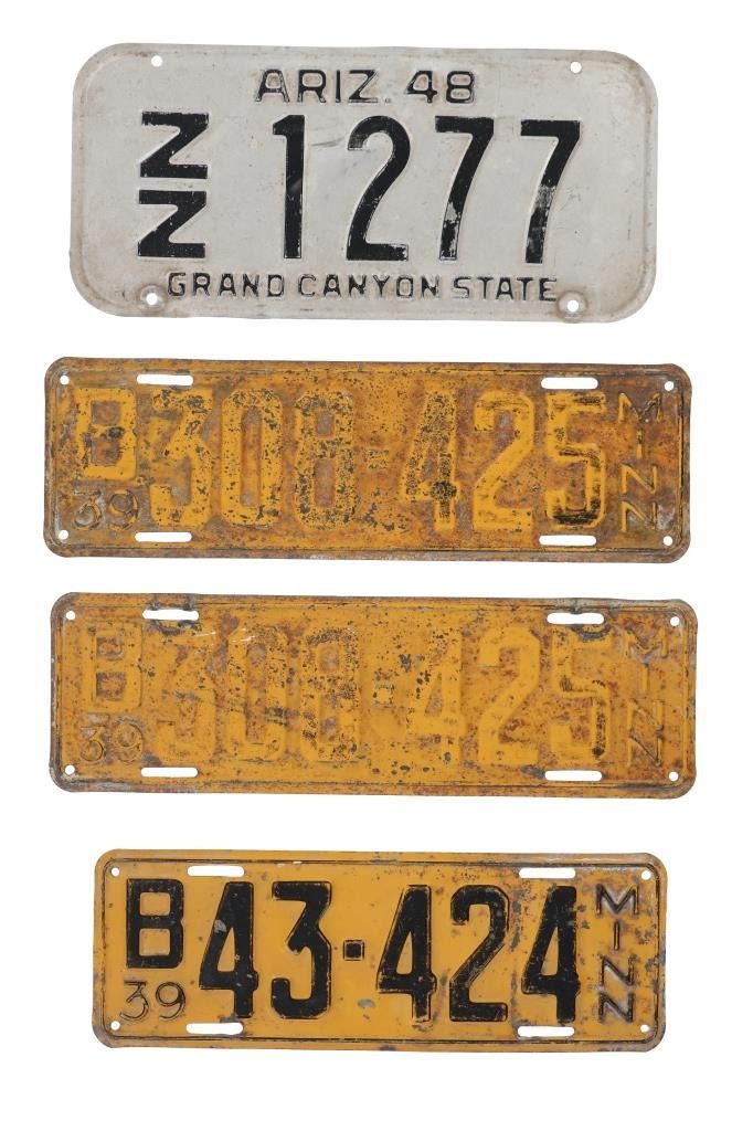 Featured in this lot are three Minnesota and one Arizona license plates circa 1939-1948. The three Minnesota license plates are all from the year 1939 and feature two identical plates. The license plates read, "B 39 43-424 MINN", "B 39 308-425 MINN", "B 39 308-425 MINN" and is colored yellow. The Arizona license plate is alrge and features a silver color. It reads, "NN ARIZ. 48 1277 Grand Canyon State" in black lettering. The plates show good condition overall with wear present from their age and use over the years. Chipping and oxidization present on Minnesota plates. The Minnesota plates measure from 4 7/16" L x 12 3/4" W to 4 7/16" L x 14 3/8" W. The Arizona plate measures 6 1/8" L x 13 1/16" W. They have a collective weight of 1 pound and 8 ounces.