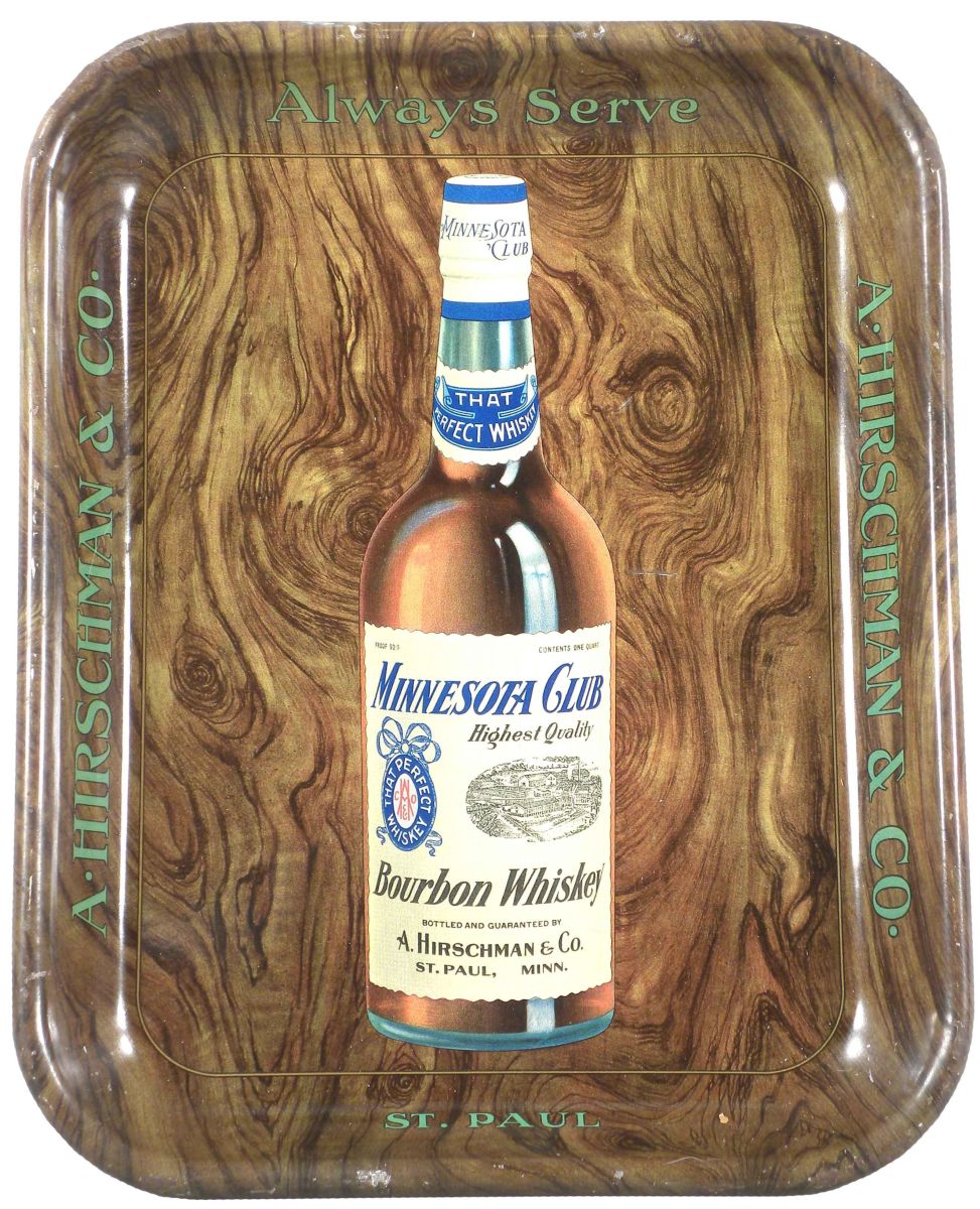 Minnesota Club Bourbon Tin Serving Tray. A. Hirschaman & Co. St. Paul, Minn. One small scratch at 3:00 and a few edge chips otherwise excellent condition. 10 1/2 X 13 1/4 inches.