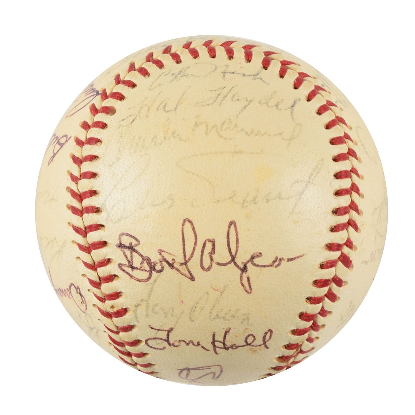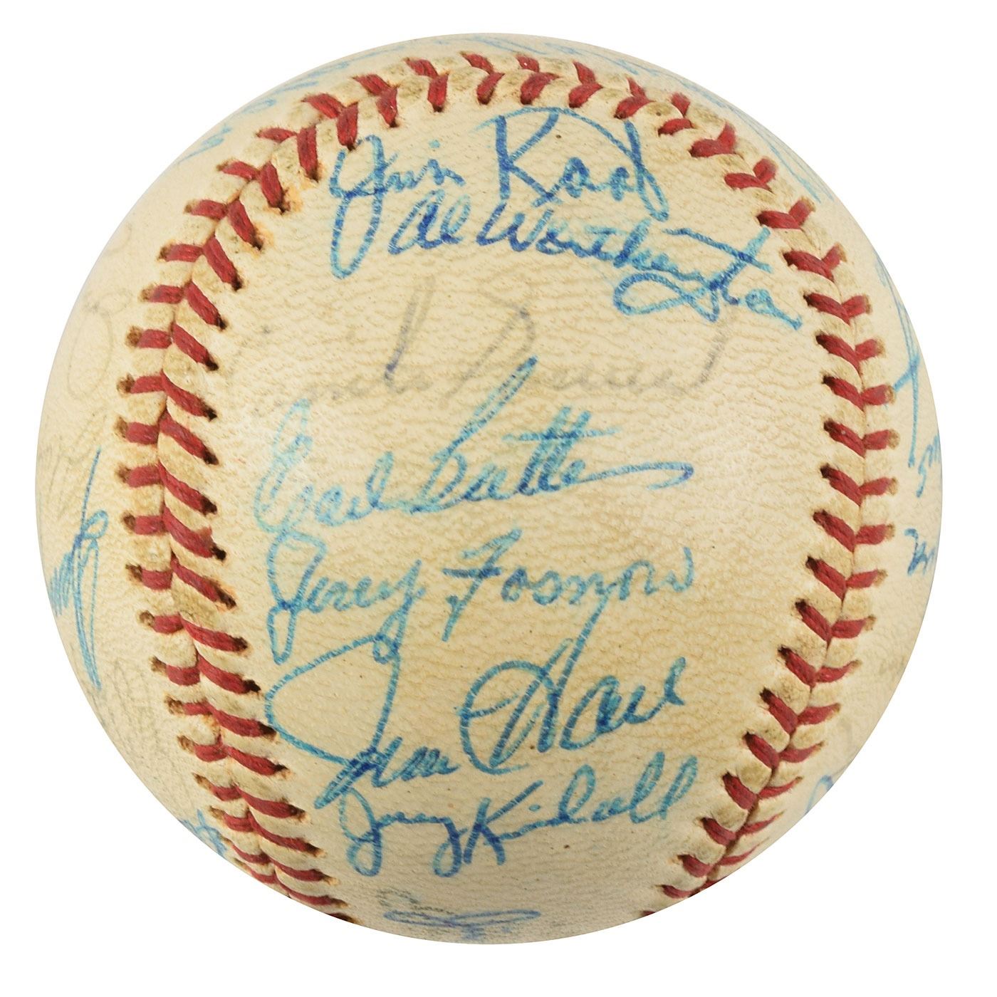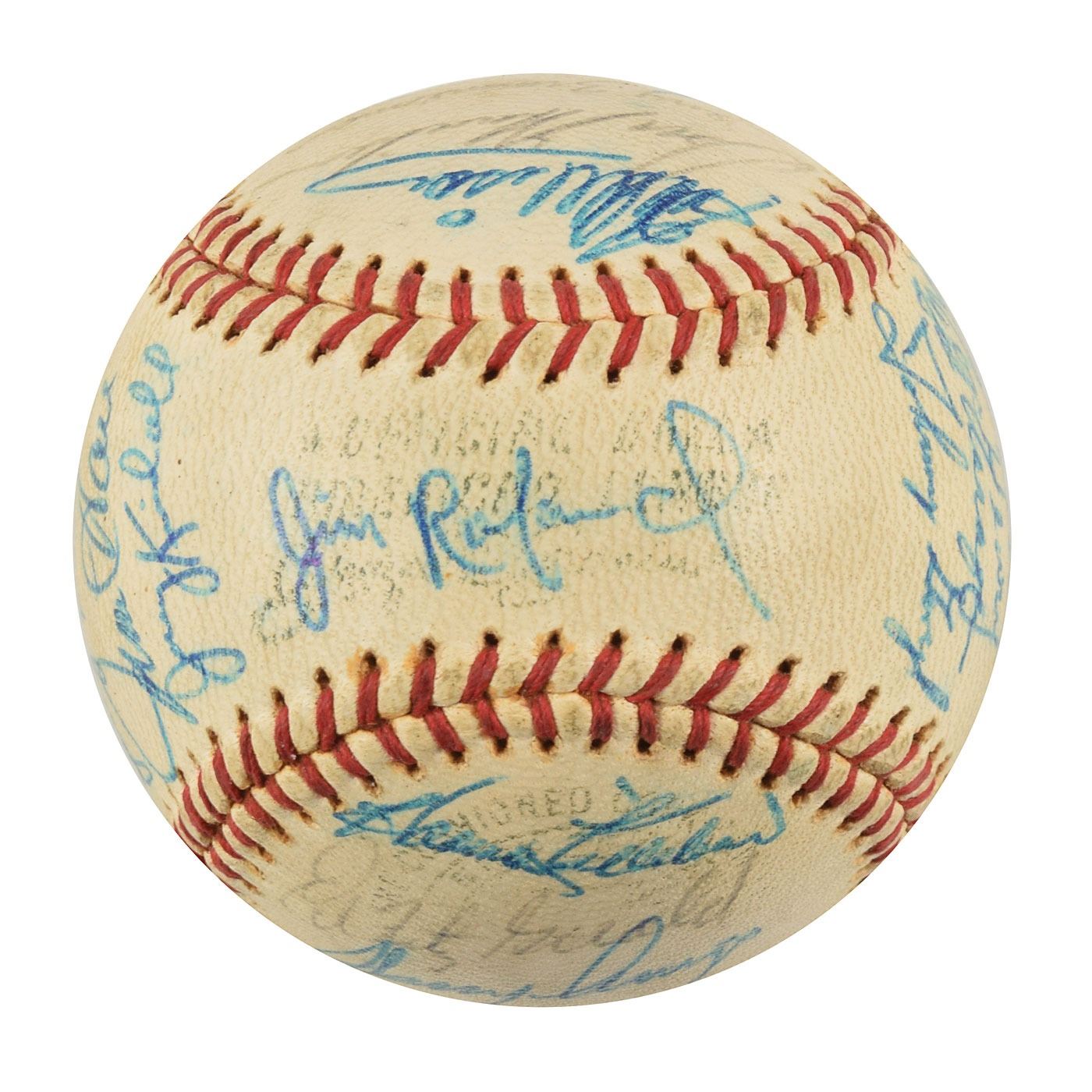 Two Minnesota Twins team-signed official American League baseballs, one signed by the 1964 team and the other signed by the 1970 team. The 1964 ball is signed in ballpoint on the sweet spot and side panels by 30, including Harmon Killebrew, Ed Fitz Gerald, Gerry Arrigo, Floyd Baker, Jim Perry, Sam Mele (ss), Zoilo Versalles (ss), Bernie Allen, Dick Stigman, Gordon Maltzberger, Johnny Klippstein, Frank Kostro, Ron Henry, Hal Naragon, Johnny Goryl, Jim Roland, Jim Kaat, Al Worthington, Camilo Pascual, Earl Battey, Jerry Fosnow, Jimmie Hall, Jerry Kindall, Bob Allison, Don Mincher, Jerry Zimmerman, Tony Oliva, Rich Rollins, Mudcat Grant, and Bill Pleis. The 1970 ball is signed in ballpoint on the sweet spot and side panels by 31, including: Harmon Killebrew (lightly over the league stamp), Rod Carew, Bill Rigney (ss), Cotton Nash, Hal Haydel, Charlie Manuel, Luis Tiant, Brant Alyea, Tony Oliva, Tom Hall, Jim Kaat, Leo Cardenas, Frank Quilici, Rich Reese, Vern Morgan, George Mitterwald, Paul Ratliff, Frank Crosetti, Buck Rodgers, Marv Grissom, Tom Tischinski, Jim Perry, Steve Brye, Jim Holt, Bob Allison, Rick Dempsey, Danny Thompson, Rick Renick, Ron Perranoski, Bill Zepp, and Cesar Tovar. In overall very good to fine condition, with various signatures a few shades light.