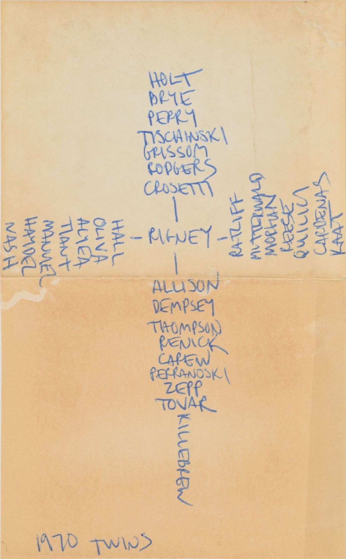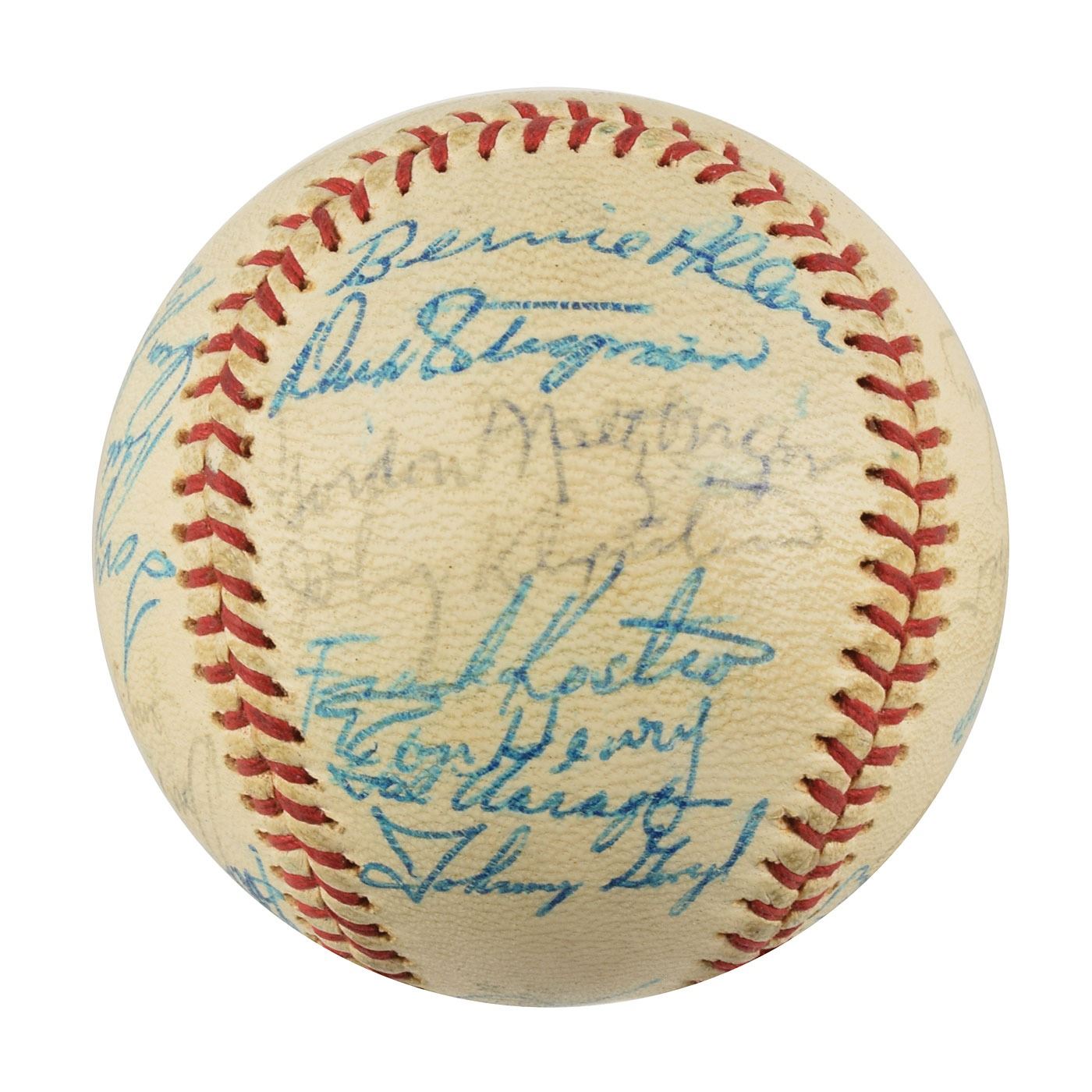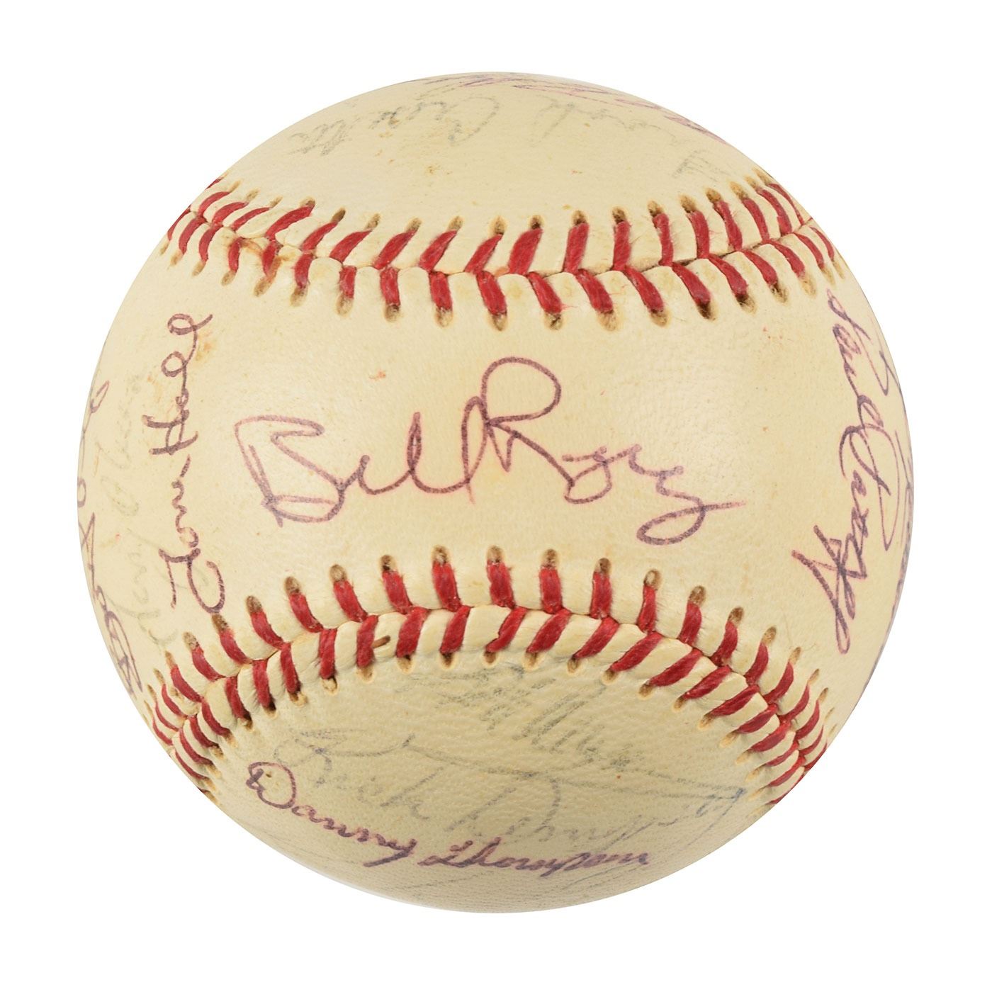 Two Minnesota Twins team-signed official American League baseballs, one signed by the 1964 team and the other signed by the 1970 team. The 1964 ball is signed in ballpoint on the sweet spot and side panels by 30, including Harmon Killebrew, Ed Fitz Gerald, Gerry Arrigo, Floyd Baker, Jim Perry, Sam Mele (ss), Zoilo Versalles (ss), Bernie Allen, Dick Stigman, Gordon Maltzberger, Johnny Klippstein, Frank Kostro, Ron Henry, Hal Naragon, Johnny Goryl, Jim Roland, Jim Kaat, Al Worthington, Camilo Pascual, Earl Battey, Jerry Fosnow, Jimmie Hall, Jerry Kindall, Bob Allison, Don Mincher, Jerry Zimmerman, Tony Oliva, Rich Rollins, Mudcat Grant, and Bill Pleis. The 1970 ball is signed in ballpoint on the sweet spot and side panels by 31, including: Harmon Killebrew (lightly over the league stamp), Rod Carew, Bill Rigney (ss), Cotton Nash, Hal Haydel, Charlie Manuel, Luis Tiant, Brant Alyea, Tony Oliva, Tom Hall, Jim Kaat, Leo Cardenas, Frank Quilici, Rich Reese, Vern Morgan, George Mitterwald, Paul Ratliff, Frank Crosetti, Buck Rodgers, Marv Grissom, Tom Tischinski, Jim Perry, Steve Brye, Jim Holt, Bob Allison, Rick Dempsey, Danny Thompson, Rick Renick, Ron Perranoski, Bill Zepp, and Cesar Tovar. In overall very good to fine condition, with various signatures a few shades light.