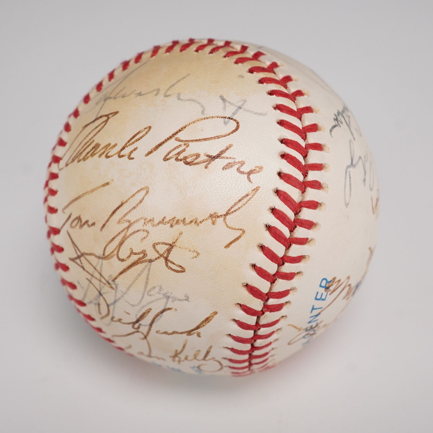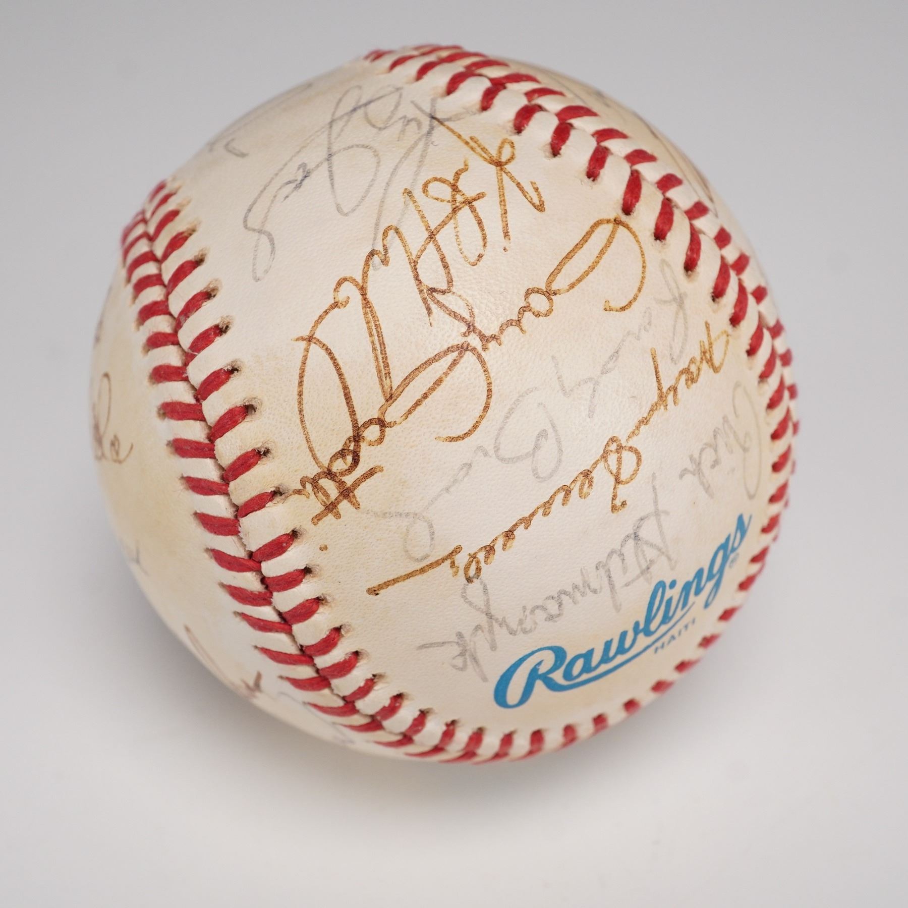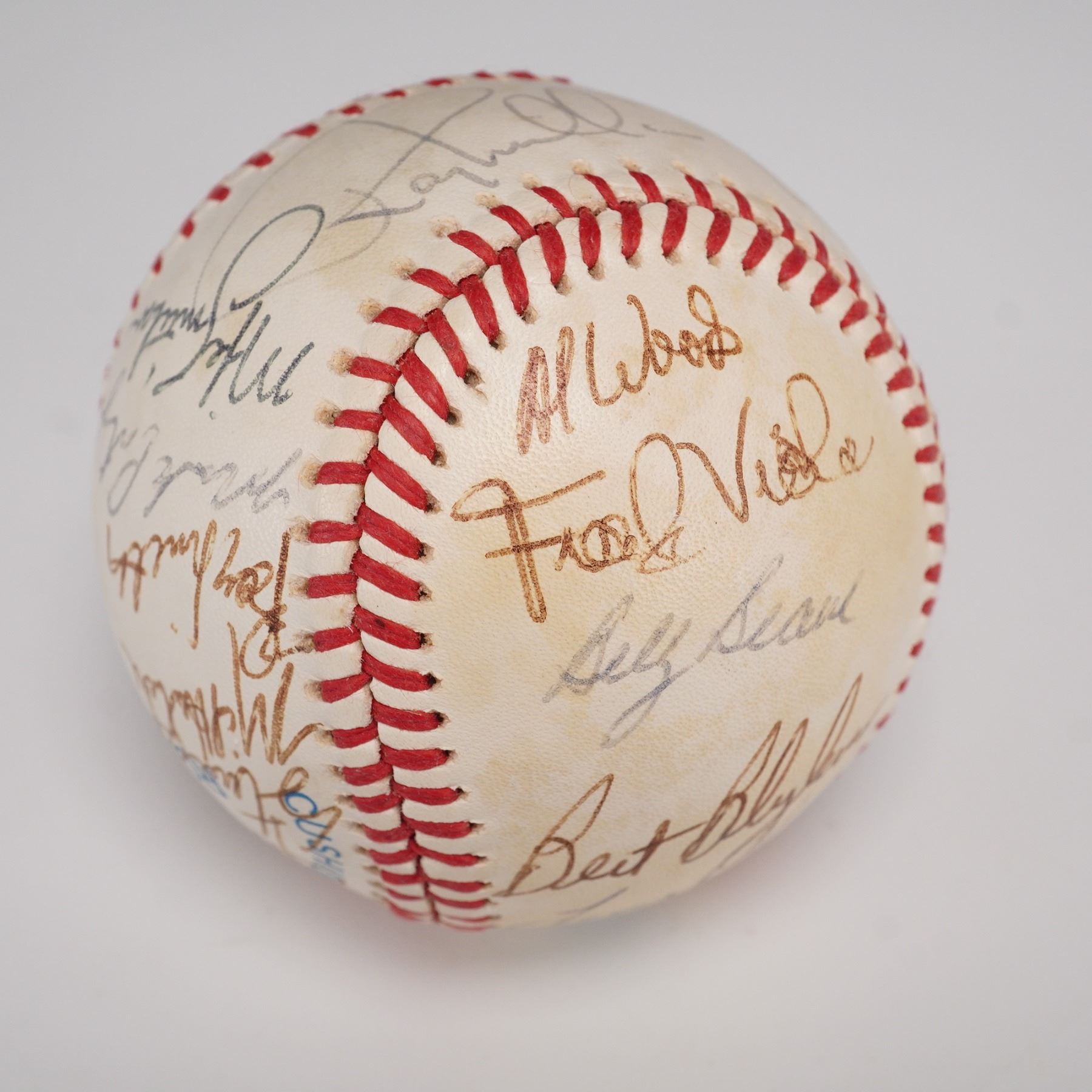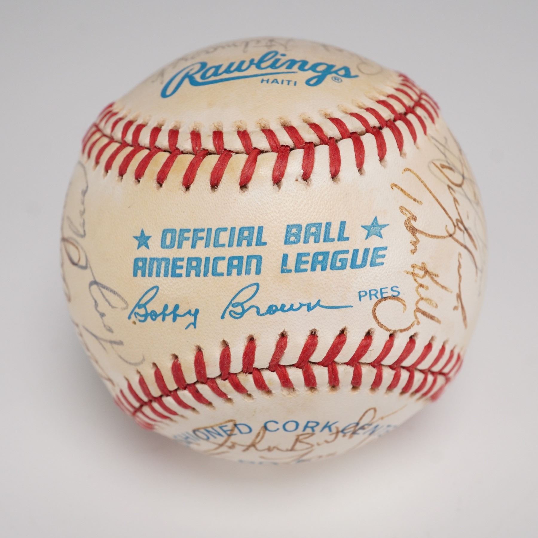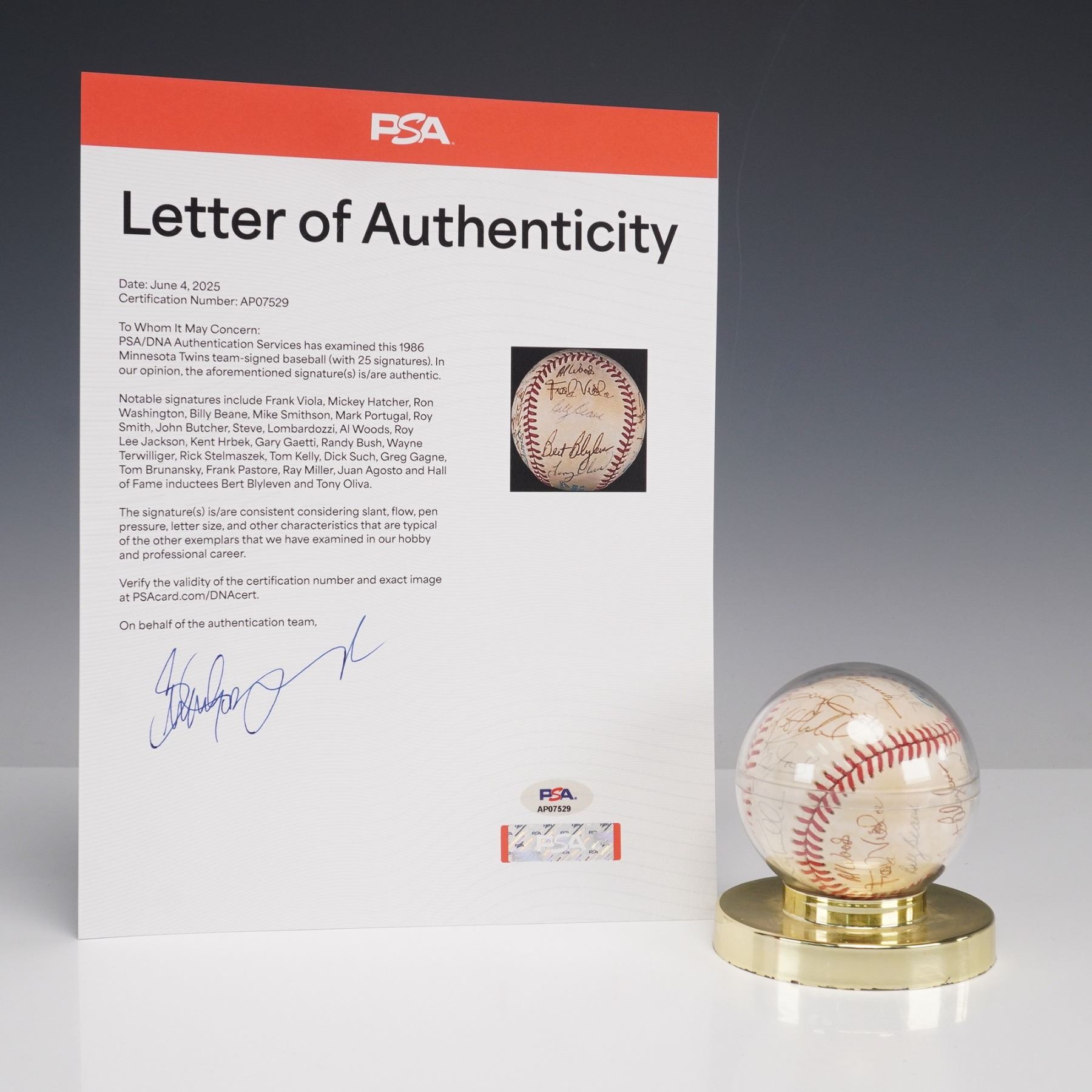 Official Rawlings American League baseball (Bobby Brown, Pres) signed by 25 members of the 1986 Minnesota Twins. Signatures include Frank Viola, Mickey Hatcher, Ron Washington, Billy Beane, Mike Smithson, Mark Portugal, Roy Smith, John Butcher, Steve Lombardozzi, Al Woods, Roy Lee Jackson, Kent Hrbek, Gary Gaetti, Randy Bush, Wayne Terwilliger, Rick Stelmaszek, Tom Kelly, Dick Such, Greg Gagne, Tom Brunansky, Frank Pastore, Ray Miller, Juan Agosto and Hall of Famers Bert Blyleven and Tony Oliva. The ball displays clear blue league markings and well-preserved red stitching, with signatures in both blue and brown ink showing strong legibility. Accompanied by a full PSA/DNA Letter of Authenticity dated June 4, 2025, certifying the signatures as authentic. A fine collectible from a notable Twins roster. Measures in case: 4"H.