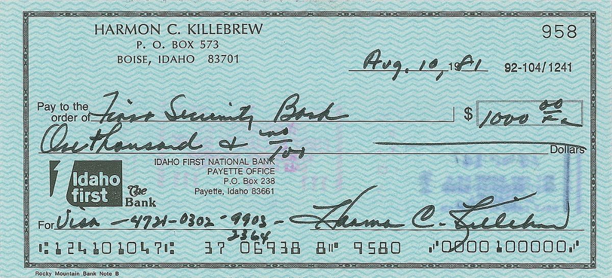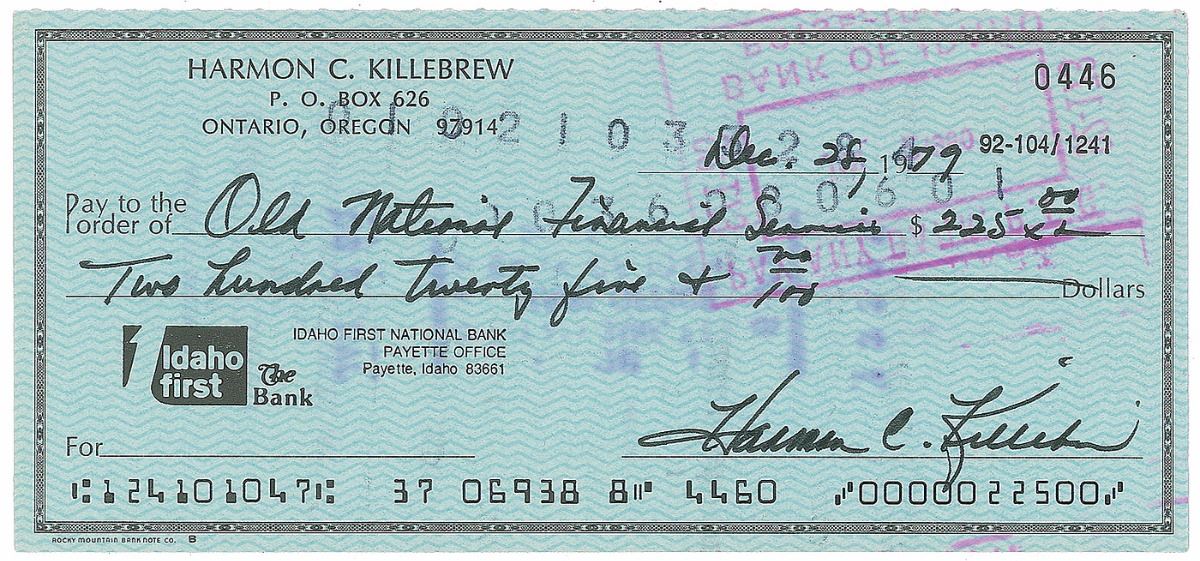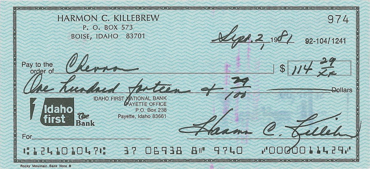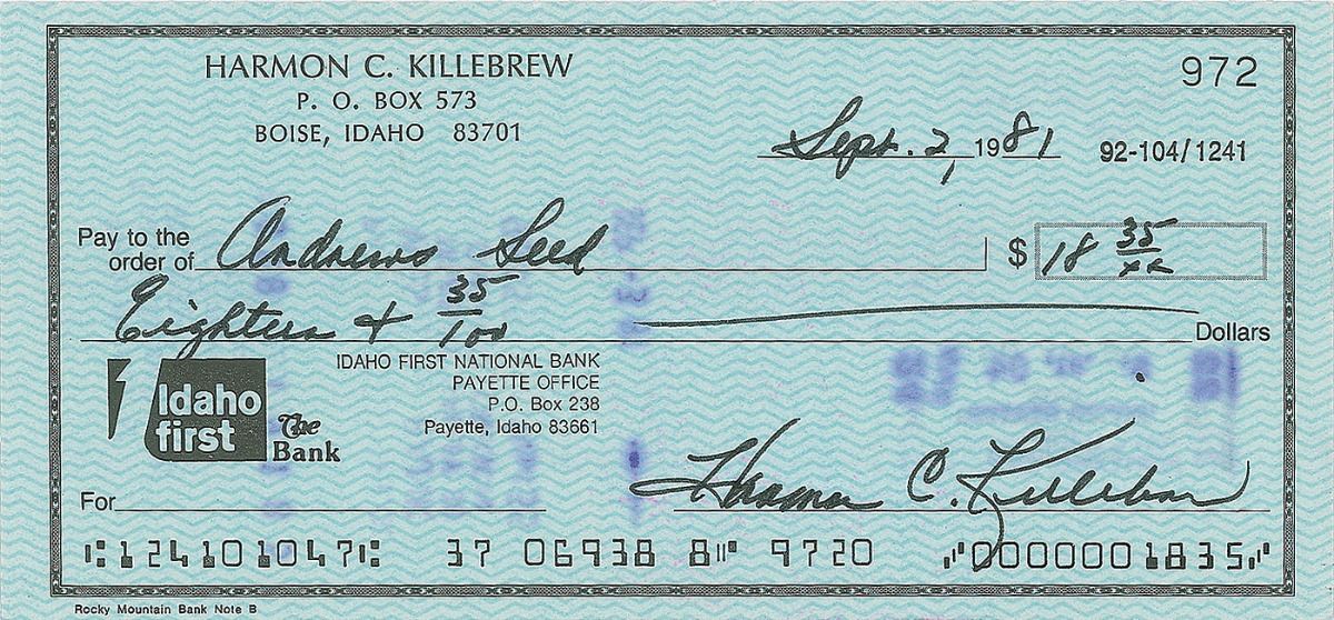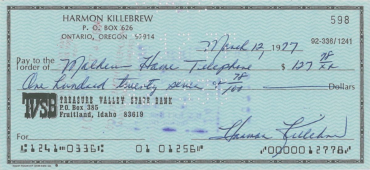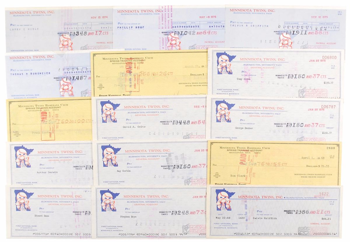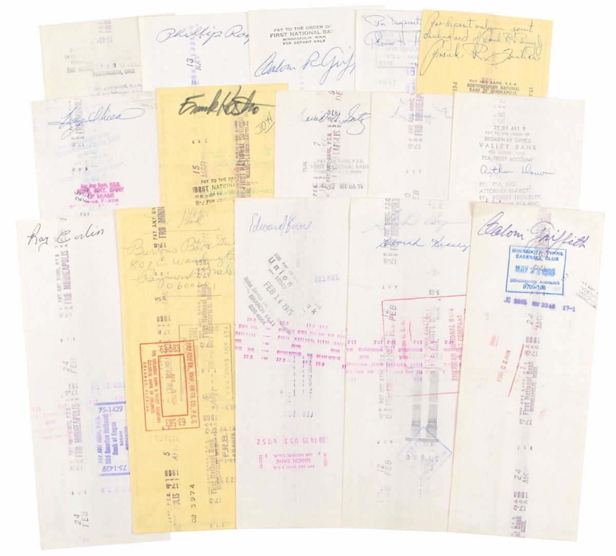 Fantastic collection of nineteen checks signed by Minnesota Twins players, including: five personal checks each filled out and signed by Hall of Famer Harmon Killebrew, four signed “Harmon C. Killebrew” and one “Harmon Killebrew,” dated from 1977 to 1981; and fourteen Minnesota Twins payroll checks, dated 1968 to 1975, each endorsed on the reverse by the recipient, including: Tony Oliva, Calvin Griffith (2), Phil Roof, Frank Quilici, Tom Burgmeier, Frank Kostro, Dave Goltz, George ‘Joe’ Decker, Arthur ‘Bobby’ Darwin, Ray Corbin, Ron Clark, Edward Bane, and Steve Brye. Also includes an unsigned check issued to Larry Hisle. In overall fine condition, with expected bank stamps and check wear.