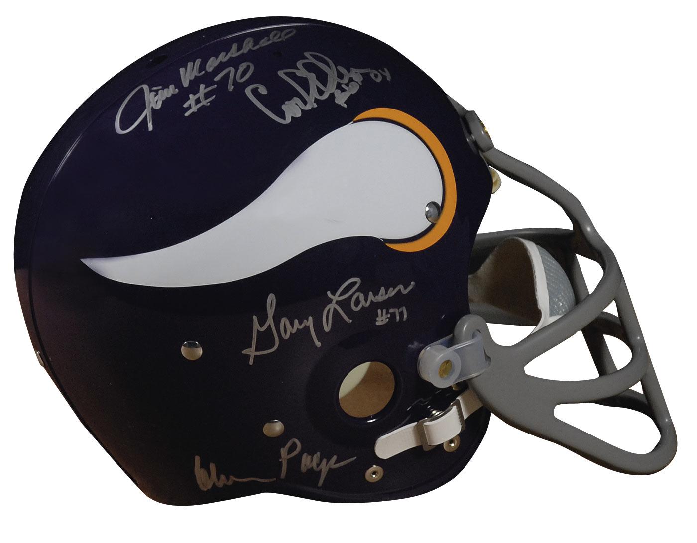 Official Historic Helmet suspension-style Minnesota Vikings football helmet, bearing the Alan Page style face mask, signed in silver ink on the side by the “Purple People Eaters” Jim Marshall, Carl Eller, Gary Larsen, and Alan Page. In very fine condition. Pre-certified Steve Grad/PSA/DNA and RRAuction COA.
