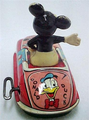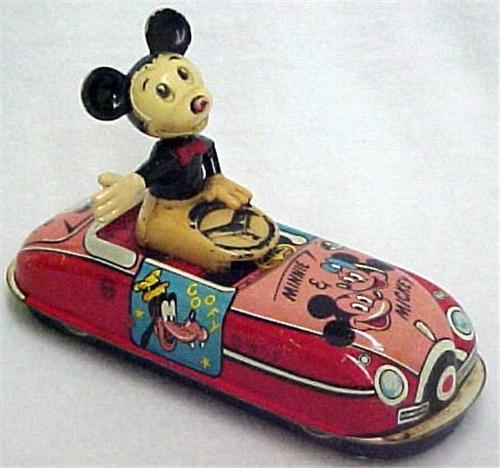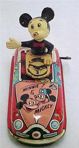 Minnie & Mickey Car; tin wind-up with plastic Mickey Driver; Marx Toys Made in the United States of America; C W.D.P; 7" across by 4" high; Some minor paint scratches on car; some wear on Mickey; damage and repair done under chin.