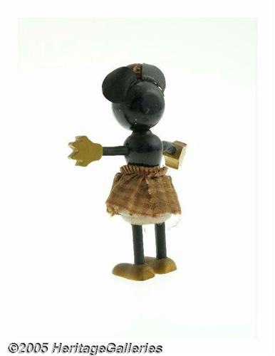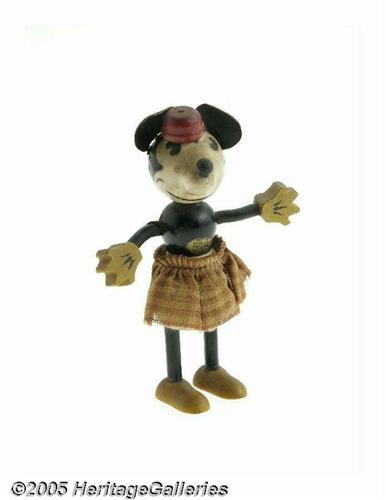 <B>Minnie Mouse 5" Fun-e-Flex Toy (George Borgfeldt Company, 1930s).</B></I> Among the earliest, rarest and most collectible of Disney toys are the delightful Fun-e-Flex toys. Manufactured by Fun-e-Flex and distributed by the George Borgfeldt Company in the early 1930s, they are distinguished by movable limbs (either covered wire or springs) attached to brightly painted wooden bodies separately attached heads. As you would expect, the relative fragility of the limbs, tail and head make finding exceptional examples a major challenge for the serious collector of Disneyana. Borgfeldt's toy line played a large part in making The Mouse and friends an indispensable part of American life during the early part of the Depression -- and their Fun-e-Flex figurines were a major part of their success. Any collector of early Disneyana will tell you that the cloth skirts on the early Borgfeldt figures are practically non-existent -- and for good reason. Using an inexpensive and occasionally poorly-sewn material, they inevitably were lost or destroyed by their young owners. This early Minnie Mouse, however, is an exception. Although showing some fading and wear, the original skirt is present. Minnie "name label" (with the Walt E. Disney copyright notice) is still intact on Minnie's stomach. The hat flower is no longer present nor is Minnie's tail. While the ears are present, it appears that they have been re-glued. Overall light wear. Although Minnie was produced in 1931, she doesn't look a day over 29! <I>From the Larry Jacobs Collection.</B></I>
