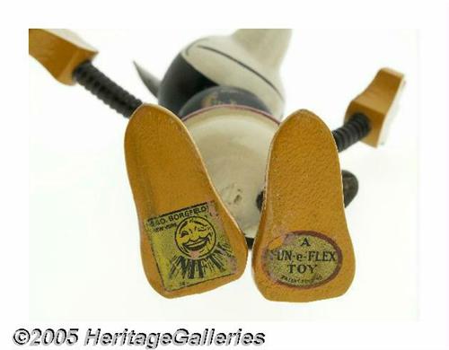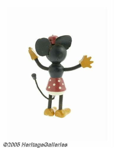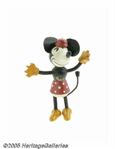 <B>Minnie Mouse 6" Fun-e-Flex with Tail (George Borgfeldt Company, 1930s).</B></I> Dressed to kill, in a red hat and a brightly polka-dotted skirt, this four fingered Minnie awaits her new home with open arms. While the Minnie Mouse label just about her skirt line is only partially present, the "Walt E. Disney" copyright notice is quite clear; additionally, on the bottom of Minnie's wooden shoes, the Borgfeldt label is complete while the Fun-e-Flex label is about 90% present. Minnie's tail is complete and the fragile ears show only minor wear around their edges. With sharp, bright colors, Minnie remains an outstanding example of this rare early Borgfeldt toy. <I>From the Larry Jacobs Collection.</B></I>