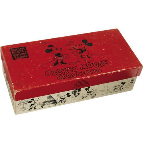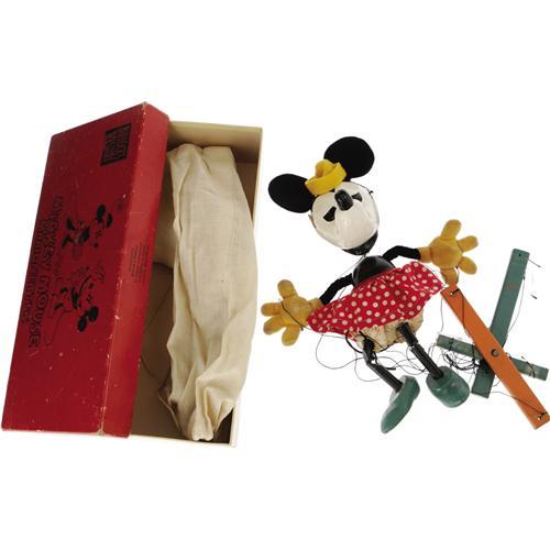 <B>Minnie Mouse Marionette in Original Box (Bullock's Wilshire, circa 1935).</B></I> Here's the companion to the Mickey marionette offered elsewhere in this catalog. Both items were originally sold in the historic Los Angeles department store in the 1930s. Minnie is sporting a gold-colored felt hat and a polka-dot dress; her white bloomers beneath, feature a purple patch. Very minor soiling on the bloomers; all other cloth and velour items look good. Like our Mickey, this marionette has one leg separated at the joint, which could be repaired. The composition head and feet look good. The box is in a bit better shape than usual, and grades Very Good; other than the separated leg, the marionette is in Excellent condition. <BR><BR><B>Important notice:</B> Heritage usually auctions material at the rate of 200-250 lots per hour. On some occasions eBay Live bid software or the Internet may not be able to keep up with the pace of the auction. We recommend placing a realistic absentee bid now as insurance to avoid disappointment. Occasionally the auctioneer may eliminate or reject an eBay Live bid, and the auctioneer may also reopen a lot after the close of the eBay live bidding (usually because we missed an audience bid), and may reject your bid even if it shows you as the winning bidder. By bidding via eBay Live, you agree that Heritage may award the lot to another bidder at its sole discretion under the circumstances described above or any other reasonable circumstances. Since eBay bids are not shown to us until we open the lot on the floor, we treat those bids just like floor bids. In most cases the floor responds before the eBay bid is presented to us, due to Internet lag time, so for consistency we have made it a policy that floor bids are always considered first over tie eBay live bids. Also please note that all Heritage lots purchased through eBay Live carry a 22.5% Buyer's Premium. Please make sure you read the Terms and Conditions before you bid. This lot is being auctioned in conjunction with a live floor auction by Heritage Auction Galleries. All final auction and invoice information will be supplied by Heritage Auction Galleries, and all other information should be considered preliminary. Lot:41001 <BR><BR><B>Winning Notification and Billing:</B> After the FINAL session in this auction is complete, Heritage will send e-mail and snail mail invoices. This process normally takes several days. All final auction and invoice information will be supplied by Heritage Auction Galleries, and all other information should be considered preliminary. <BR><BR>This auction will be conducted on a live auction floor and over the Internet through eBay Live. If you choose to place an absentee bid, please take a moment to <font color='#0000ff'><u><a href='http://pages.ebay.com/liveauctions/help/before/laabsentee.html'>learn how eBay Live absentee bidding works</a></u></font><font color='#000000'>