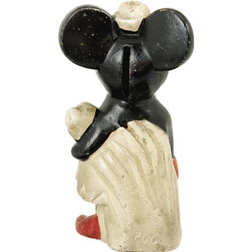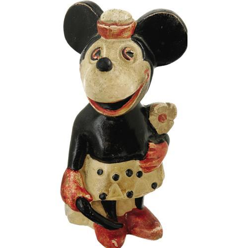 <B>Minnie Mouse Plaster Coin Bank (circa 1930s).</B></I> Minnie Mouse stands ready to safely stash your spare change in this unusual carnival-style painted plaster coin back. The figure stands 8" tall, and shows considerable wear and aging; however, very little paint loss is noted. Very unusual! <BR><BR><B>Important notice:</B> Heritage usually auctions material at the rate of 200-250 lots per hour. On some occasions eBay Live bid software or the Internet may not be able to keep up with the pace of the auction. We recommend placing a realistic absentee bid now as insurance to avoid disappointment. Occasionally the auctioneer may eliminate or reject an eBay Live bid, and the auctioneer may also reopen a lot after the close of the eBay live bidding (usually because we missed an audience bid), and may reject your bid even if it shows you as the winning bidder. By bidding via eBay Live, you agree that Heritage may award the lot to another bidder at its sole discretion under the circumstances described above or any other reasonable circumstances. Since eBay bids are not shown to us until we open the lot on the floor, we treat those bids just like floor bids. In most cases the floor responds before the eBay bid is presented to us, due to Internet lag time, so for consistency we have made it a policy that floor bids are always considered first over tie eBay live bids. Also please note that all Heritage lots purchased through eBay Live carry a 22.5% Buyer's Premium. Please make sure you read the Terms and Conditions before you bid. This lot is being auctioned in conjunction with a live floor auction by Heritage Auction Galleries. All final auction and invoice information will be supplied by Heritage Auction Galleries, and all other information should be considered preliminary. Lot:41001 <BR><BR><B>Winning Notification and Billing:</B> After the FINAL session in this auction is complete, Heritage will send e-mail and snail mail invoices. This process normally takes several days. All final auction and invoice information will be supplied by Heritage Auction Galleries, and all other information should be considered preliminary. <BR><BR>This auction will be conducted on a live auction floor and over the Internet through eBay Live. If you choose to place an absentee bid, please take a moment to <font color='#0000ff'><u><a href='http://pages.ebay.com/liveauctions/help/before/laabsentee.html'>learn how eBay Live absentee bidding works</a></u></font><font color='#000000'>