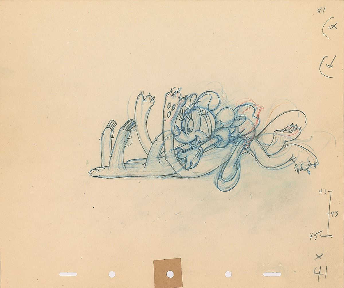 (Walt Disney Studios, 1949) Original production drawing featuring Minnie Mouse and Pluto from Pluto’s Sweater, showing the two characters fighting. Accomplished in graphite and colored pencil on untrimmed 12 x 10 animation paper. Image measures 8 x 3.5. In fine condition.