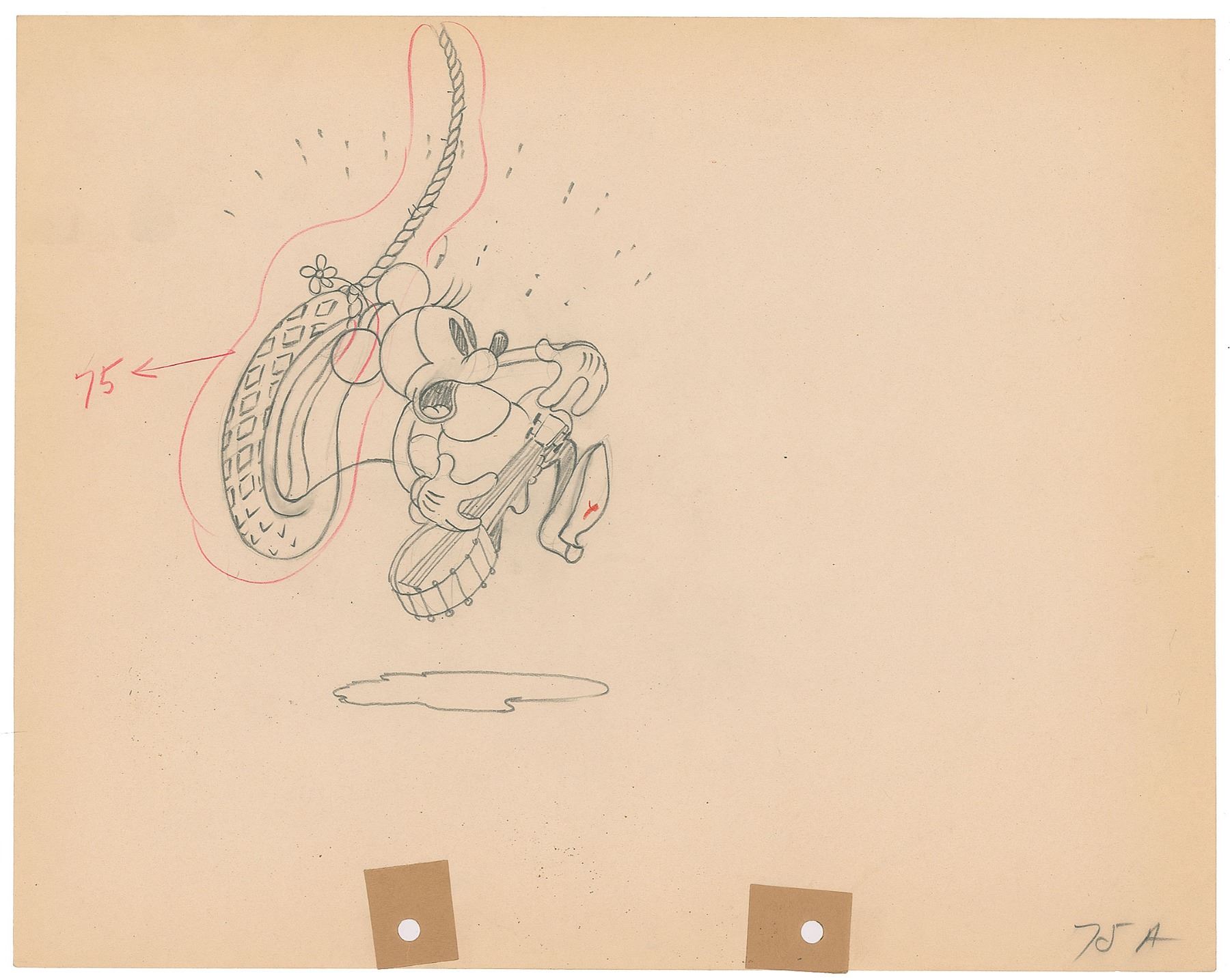 (Walt Disney Studios, 1934) Original production drawing featuring Minnie Mouse with her banjo from Camping Out, showing her leaping out of a swing in startled surprise as a swarm of mosquitos approaches. Accomplished in graphite and colored pencil on untrimmed 12 x 9.5 animation paper, marked "75A" in the lower corner. Image measures 4 x 6. In fine condition.