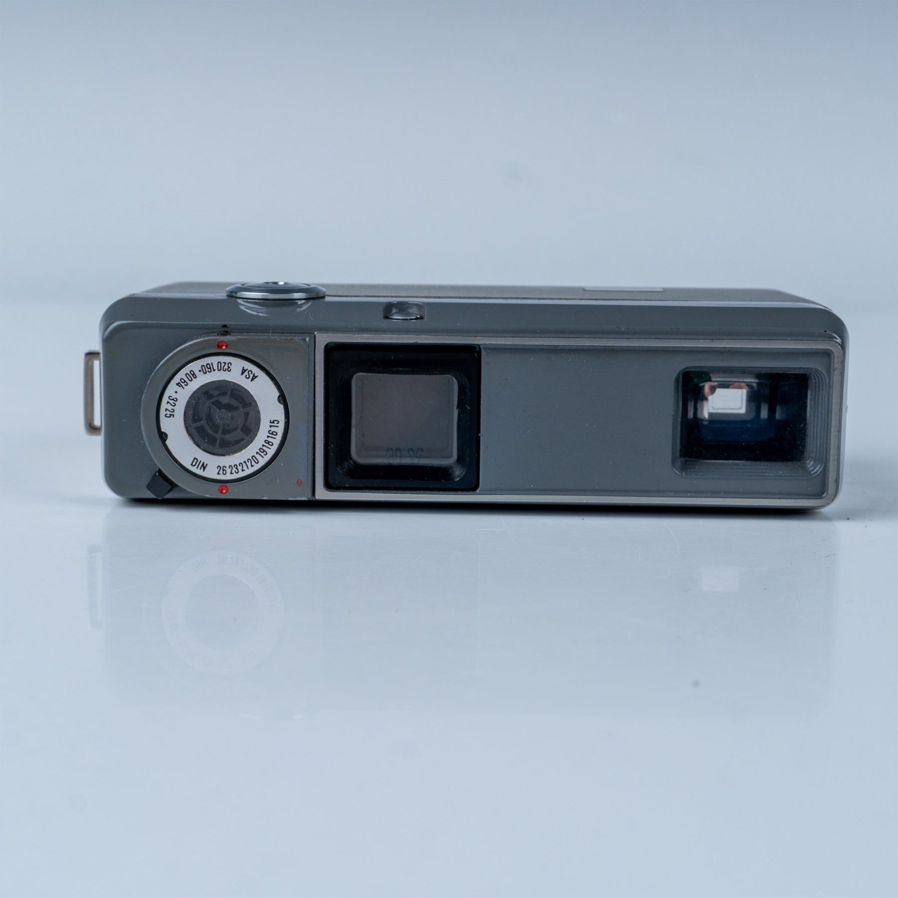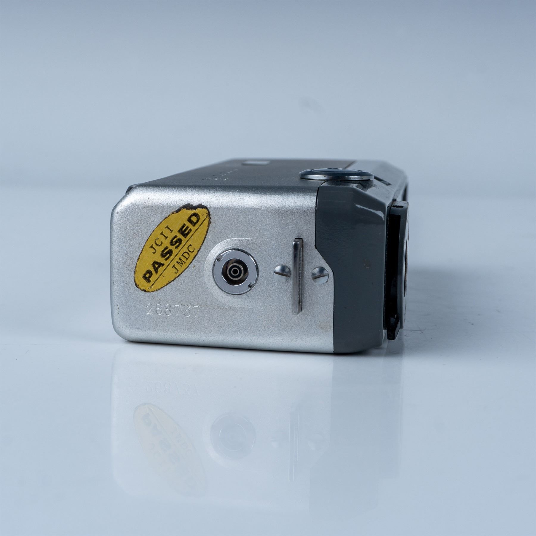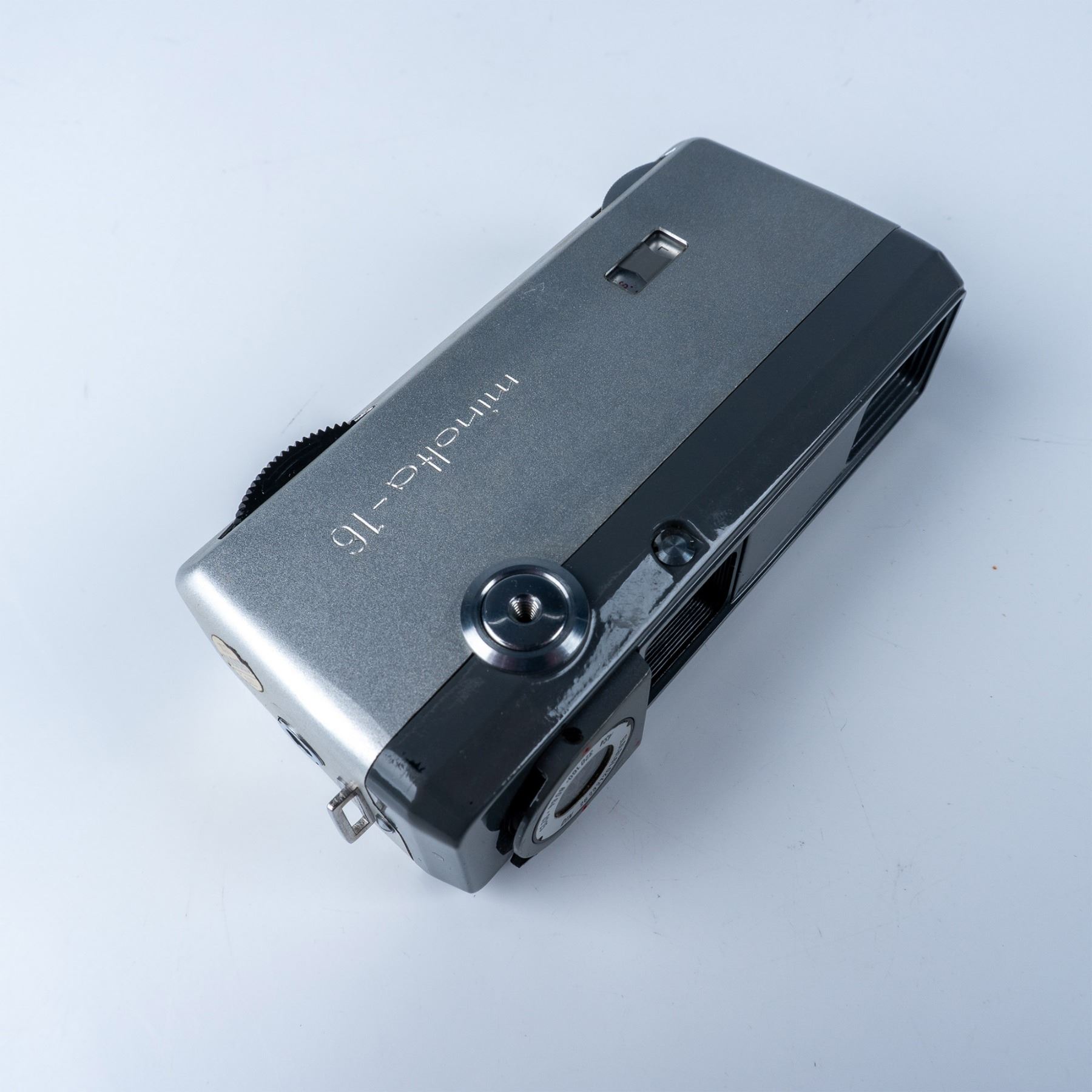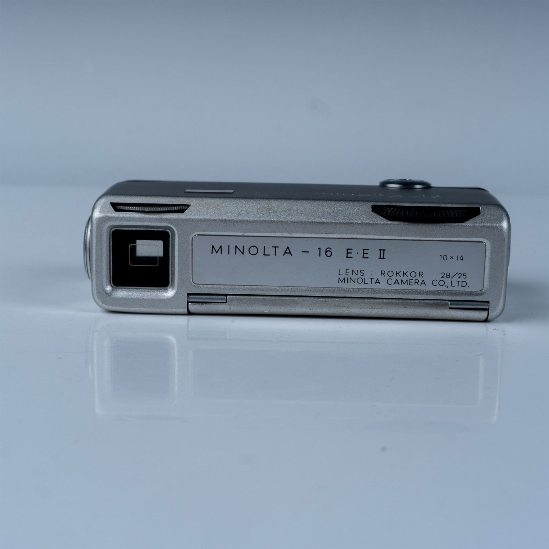Vintage Minolta 16 EE II subminiature camera manufactured by Minolta Camera Co., Ltd., Japan. This compact and innovative 16mm film camera features a Rokkor 28mm f2.5 lens and a unique sliding mechanism for operation. Known for its exceptional build quality and portability, this camera was designed for enthusiasts of subminiature photography. The camera’s compact design and precision optics make it a collectible item.
