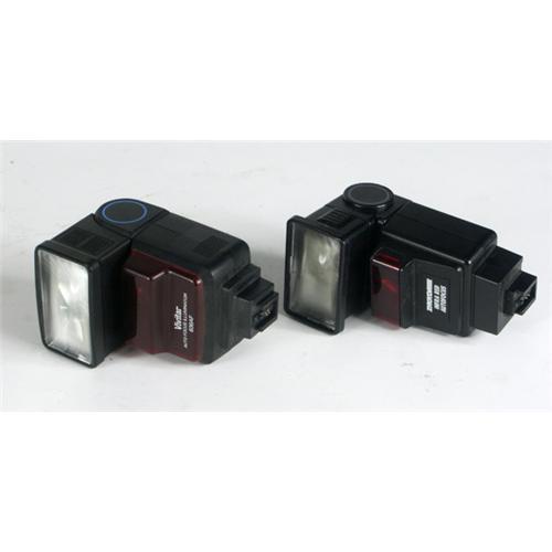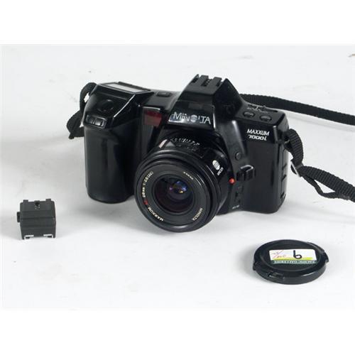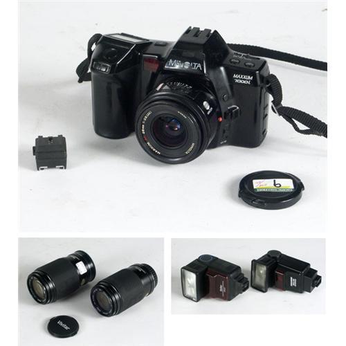 A Minolta Camera Maxim 7000L with six pieces total in the lot to include the camera, flash adapter, a pair of Vivitar lenses- auto focus Zoom 52mm (one with cover) and two flash attachments, one by Vivitar and the other by Zykkor auto-focus. Untested.