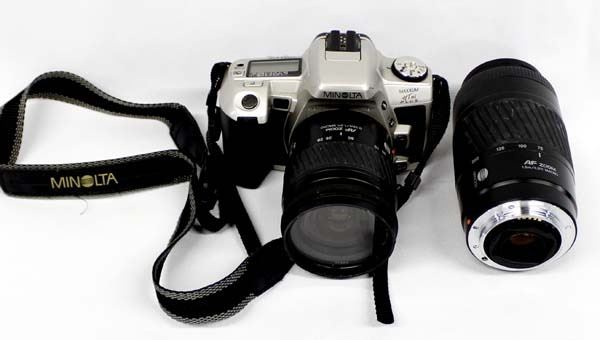 Minolta Maxxum HTsi Plus 35mm Camera & Accessories, missing battery compartment cover, compartment is clean, has 2 lenses--a Minolta AF Zoom 28-80mm lens and a Minolta AF Zoom 75-300mm lens, Tiffen 55mm UV Protector and Tiffen 62mm UV Protectors, USA, measures 5'' x 5.5'' x 4''