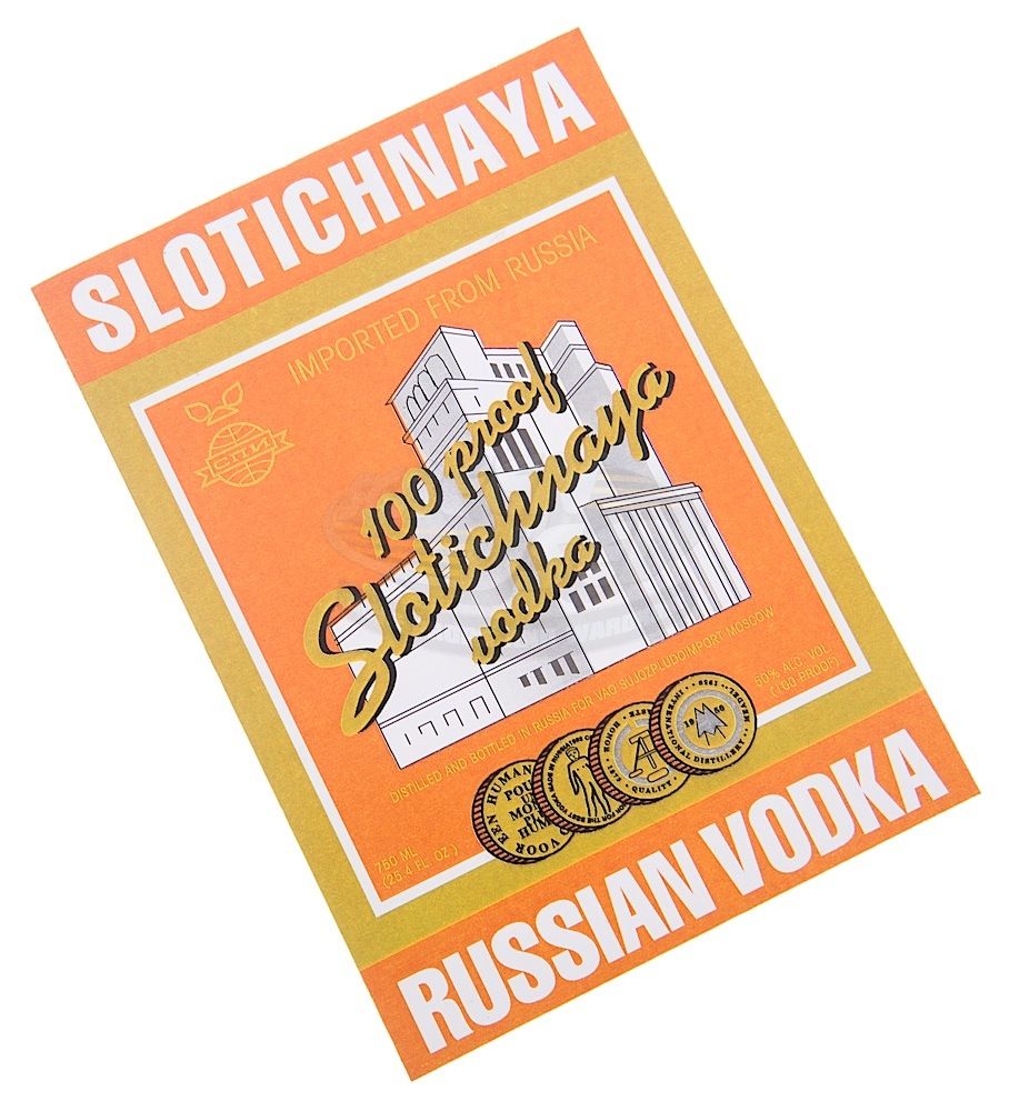 - This prop vodka label was custom-printed by the production for use as set dressing. The label features the "Slotichnaya Vodka" logo and remains in very good condition. This label was never applied to a bottle and is an unused back-up. Measures 5.5" x 4".