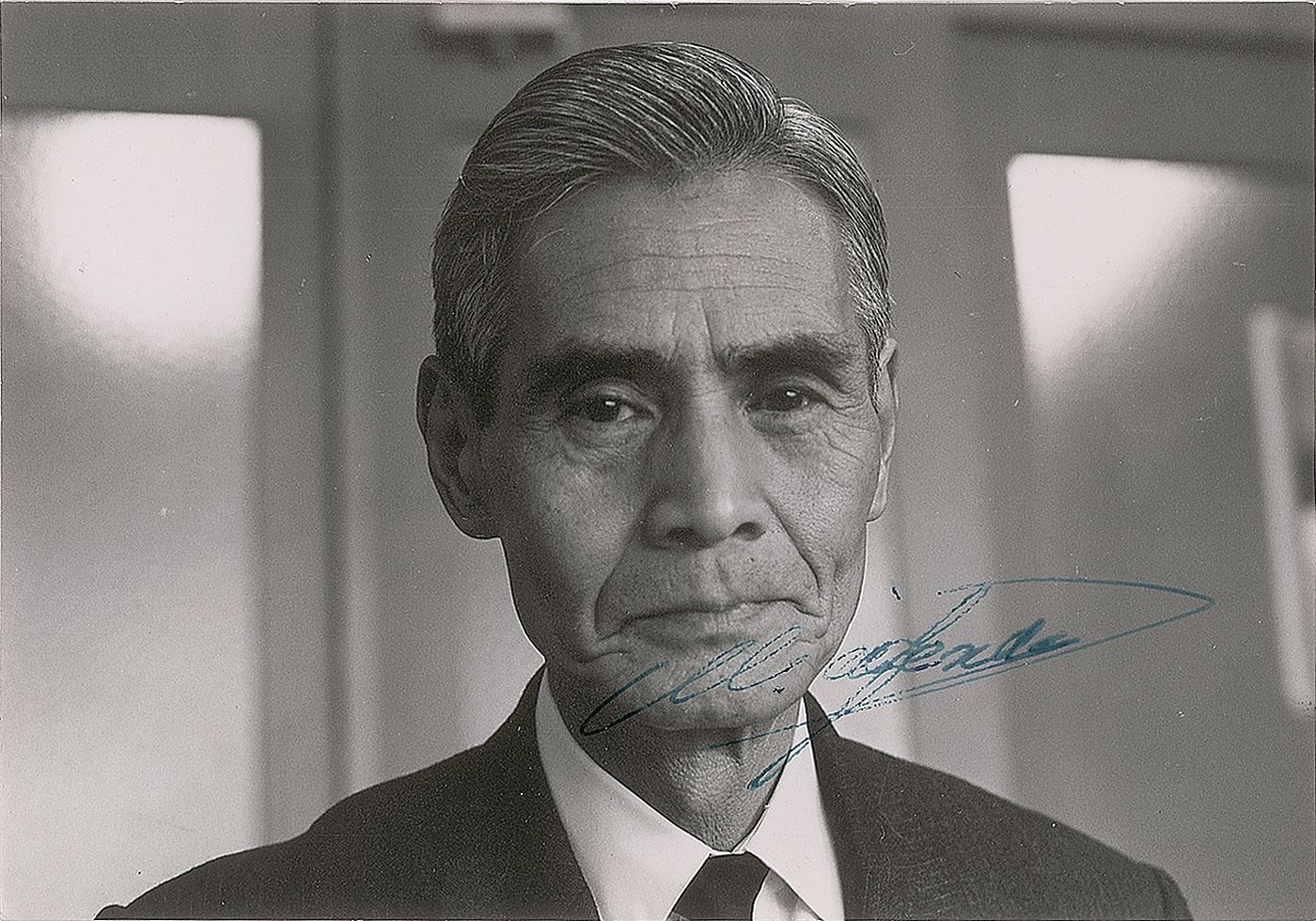 Japanese military aviator and politician (1904–1989) who is best known for helping to plan the Pearl Harbor attack; he was also the third chief of staff of the Japan Air Self-Defense Force. Glossy 4.75 x 3.5 head-and-shoulders photo of Genda, signed in black ink, "M. Genda." In fine condition.