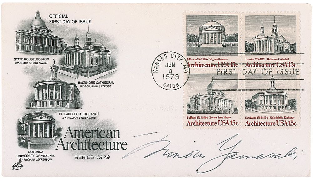 Prominent architect (1912-1986) most famous for designing the World Trade Center’s Twin Towers. FDC with a cachet honoring American Architecture, signed in black ballpoint. In fine condition.