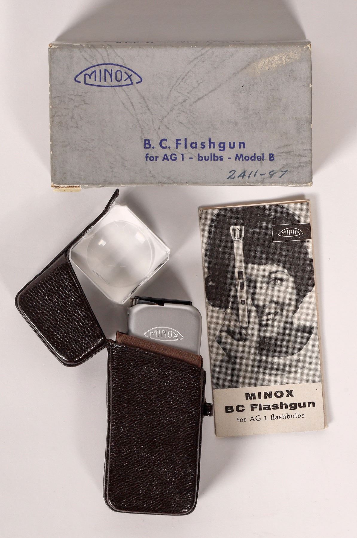 Minox BC flash model U for all cameras with flash contact. In original box with brown leather case and instructions.
