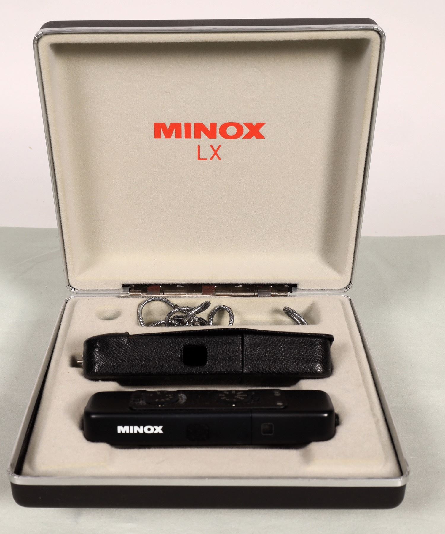 Manufactured in Germany circa 1978. Black anodized aluminum finish. In presentation case with eveready case and measuring chain. Calibrated in feet. Fully electronically controlled with built in exposure meter an electronic shutter mechanism, it requires a PX-27 battery. Even with the advanced electronics, the LX is about 10 mm smaller than the Minox C. (Serial number 2517230)