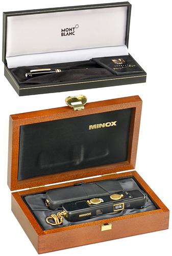 Minox TLX Edition 2000, Wetzlar, schwarz-gold mit Montblanc-Füller, Nr. 2603546 Minox TLX Edition 2000, Sonderausführung, nur 200 Stück gebaut, Knöpfe in Gold, Korpus mattschwarz, mit "Minox 3,5/15". Goldkette mit Ledertasche und Holzschatulle mit schwarzer Seide. Alle Papiere. - Mit Montblanc-Füller mit Goldfeder "Wolfgang Amadeus Mozart" im Etui. Sehr rar und gesucht!