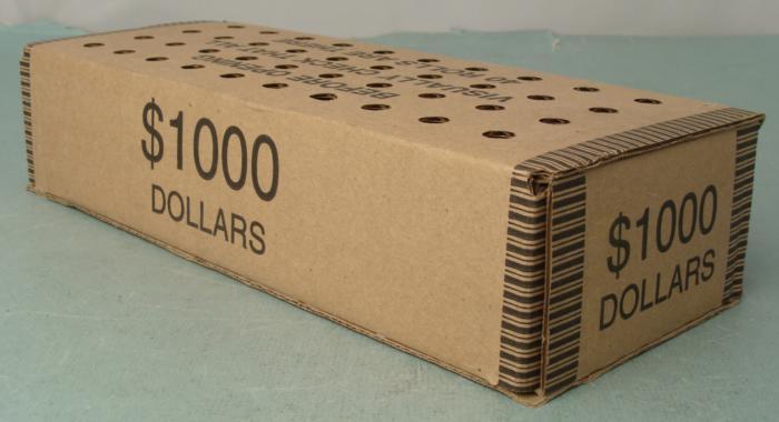This unopened and unsearched box contains 40 wrapped rolls of various dollar coins. Each roll contains 25 coins. * A coin collector will have a great time searching through this large collection. Note: The coin roll pictured is a representation of the rolls you will find inside the box. *