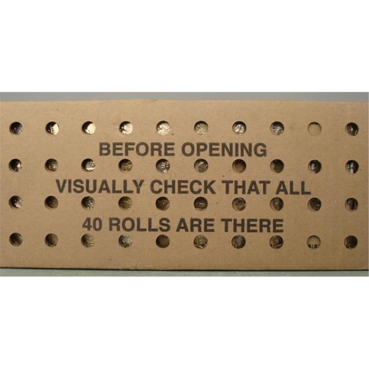 This unopened and unsearched box contains 40 wrapped rolls of various dollar coins. Each roll contains 25 coins. * A coin collector will have a great time searching through this large collection. Note: The coin roll pictured is a representation of the rolls you will find inside the box. *