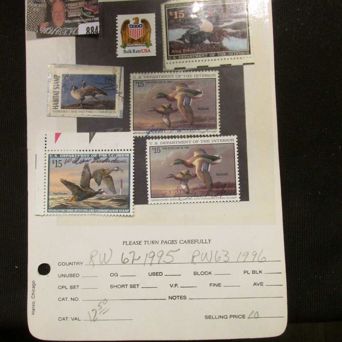 Mint "Bulk Rate USA" stamp; 1991 Nebraska Habitat Stamp, signed; RW58 1991 unsigned, but laminated; (2) signed RW62 1995; & RW63 1996 signed U.S. Department of Agriculture Migratory Bird Stamps.