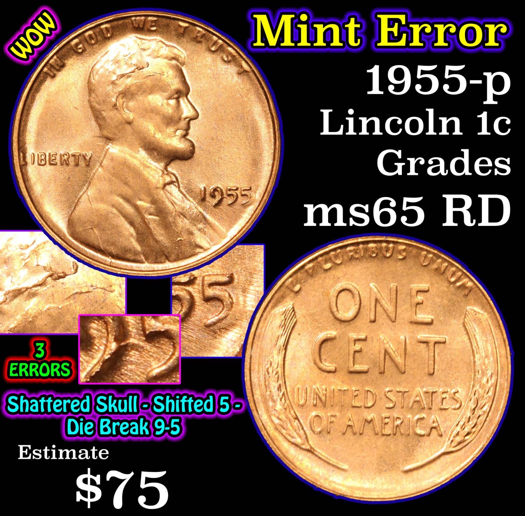Mint Error 1955-p Shattered Skull Lincoln Cent 1c Grades GEM Unc RD.