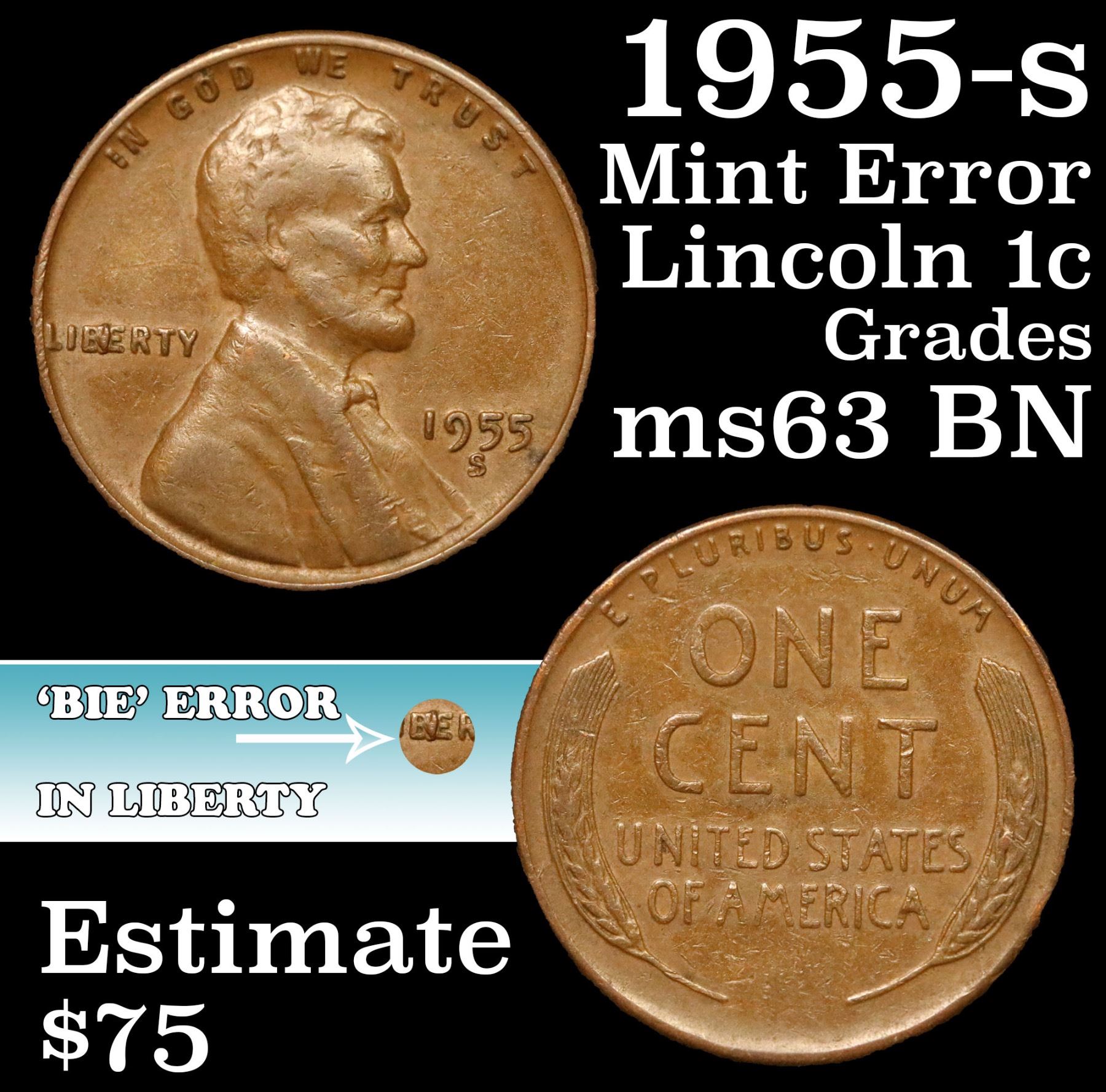Mint Error 1955-s 'BIE' Lincoln Cent 1c Grades Select Unc BN.