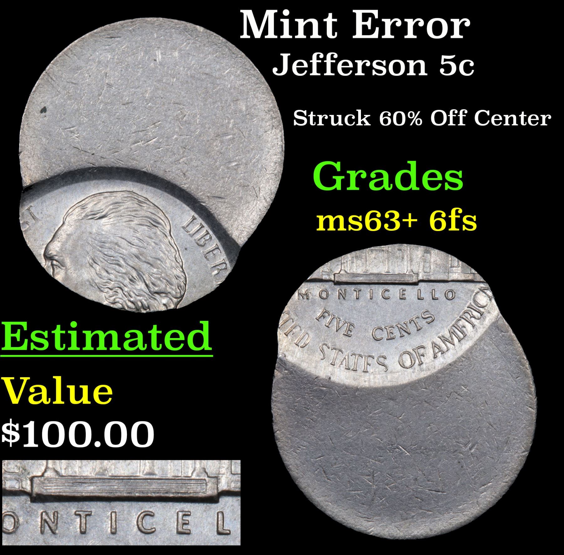 Mint Error Jefferson Nickel 5c Grades Select Unc+ 6fs.