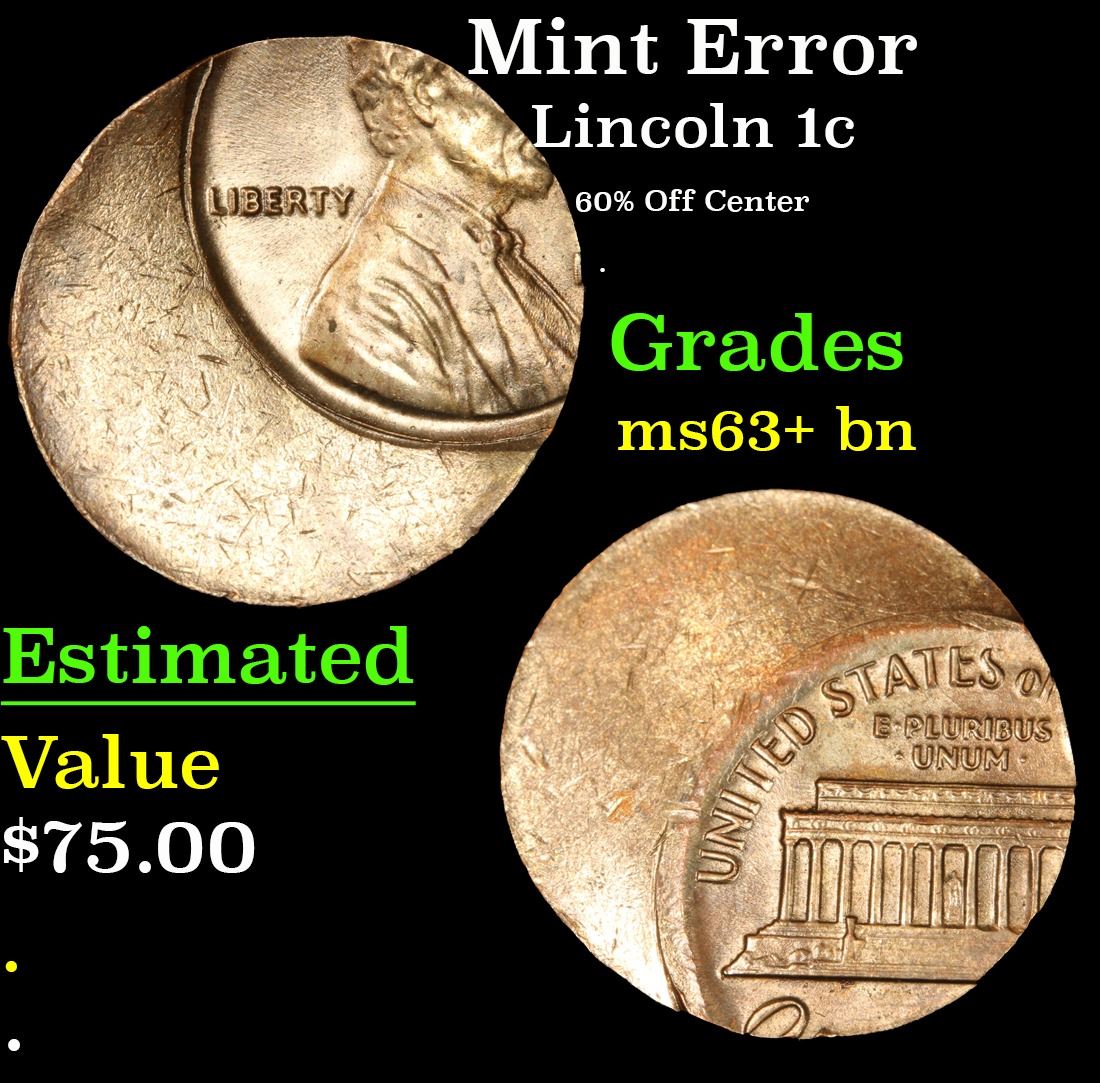 Mint Error 60% Off Center . Lincoln Cent 1c Grades Select+ Unc BN.