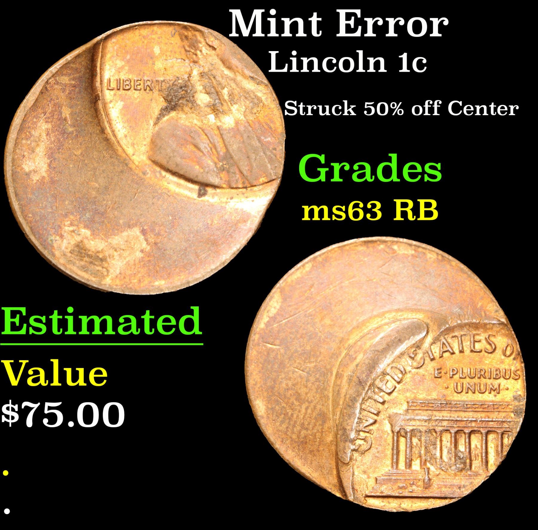 Mint Error Lincoln Cent 1c Grades Select Unc RB. Struck 50% off Center; .